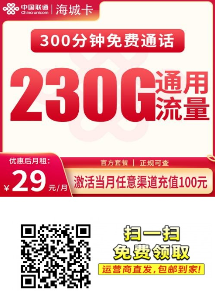 海南专属好卡来了!联通海虹卡29元月租含230G全国通用流量+100分钟通话,自主激活、正规渠道发货,还送4年会员N选1。支持5G,流量全通用不卡速,年轻人专属