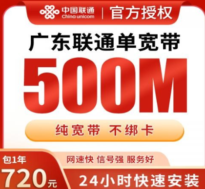 广东联通推出一款超实用的家庭宽带方案720元包年500M。整套服务不绑卡、不预存、不捆绑手机号,支持广东全省上门安装,合约期一年,到期可续约。安装费用公开透明,