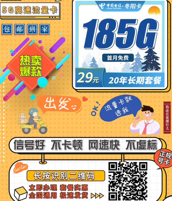 最近有粉丝私信我,说想找一张长期能用、价格稳、流量大的电信卡。别担心,这不,电信东阳卡刚好符合这三个条件。它月租29元,给到185G全国通用流量,首月还免费体验