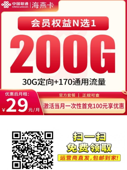 最近不少人问,有没有那种全国都能办、长期优惠、流量又大的联通卡?答案来了,这张联通海燕卡,真挺猛。29元一个月,就能拿到200G全国通用流量,再加上4年会员权益