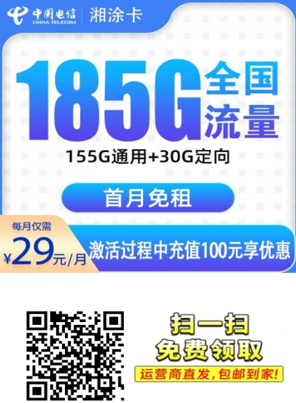 2025年11月底,新州数码实测上线的电信湘涂卡正式发售。这款中国电信推出的全国型流量套餐,月租仅29元,含185G全国流量(155G通用+30G定向),首月免