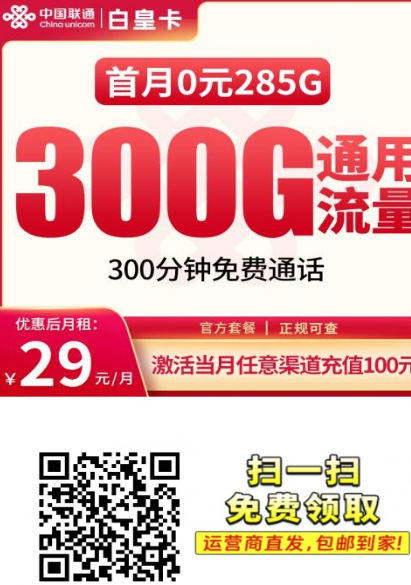联通白皇卡正式上线,全国通用、29元月租、含300G流量+300分钟通话,是一张定位长期优惠、支持5G网络的高性价比联通卡。全国范围内均可办理(除部分偏远省份)