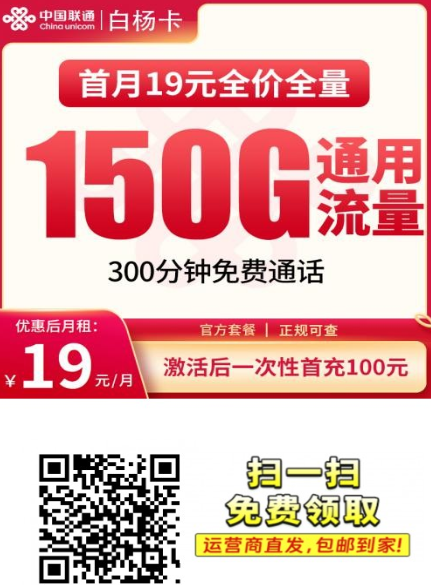 11月底,联通又放出一张狠卡:联通白杨卡。月租仅19元,就能拿到150G全国通用流量+300分钟通话,而且支持5G、自动续约、全国发货。这张卡主打长期稳定,不限