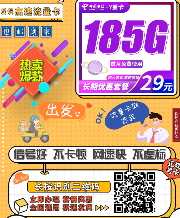 近期很多人都在找长期大流量、全国可用、不卡速的电信卡。这里要介绍的是「电信Y星卡」,一款月租仅29元、含185G全国通用流量的长期套餐,支持5G网络,无合约限制