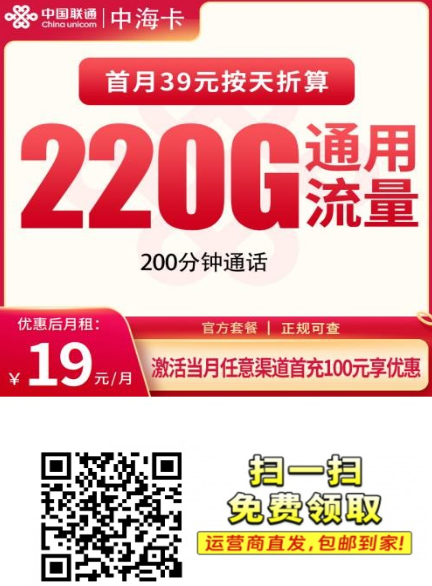 重庆用户的福利来了。这张联通中海卡是专为重庆地区推出的高性价比套餐。月租19元起,就能享受220G全国通用流量+200分钟通话。支持5G网络,首充一次即可解锁所