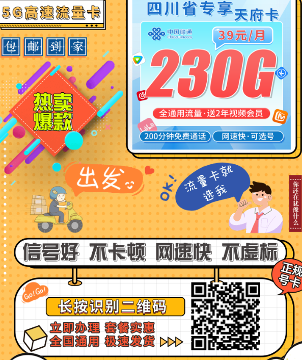 四川地区新出了一张高性价比的大流量卡,联通天府卡。每月39元就能享受230G全国通用流量、200分钟通话,还有会员权益任选,套餐有效期长达48个月。首月仅11元