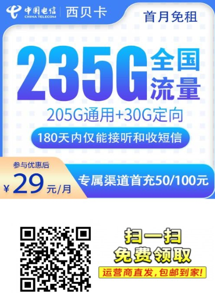 电信西贝卡停了一阵子。问它什么时候回来的人挺多。现在重新上架了。依旧是经典的 29 元 235G 架构。也还是上门激活的方式。首月免租也没变。适合平时流量需求高
