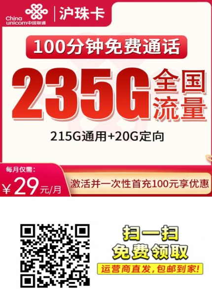联通沪珠卡,是上海地区上线的一款高性价比联通套餐。月租仅29元,就能享受235G全国通用流量+100分钟语音通话。首月全量全价,激活后一次性充值100元即可叠加