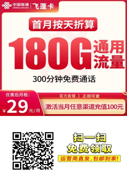 想找一张不用跑营业厅、不用拍三照、还能享受全国流量的正规联通卡?这张联通飞蓬卡真的很香。月租29元就能拿下180G全国通用流量+300分钟通话,支持5G网速、自