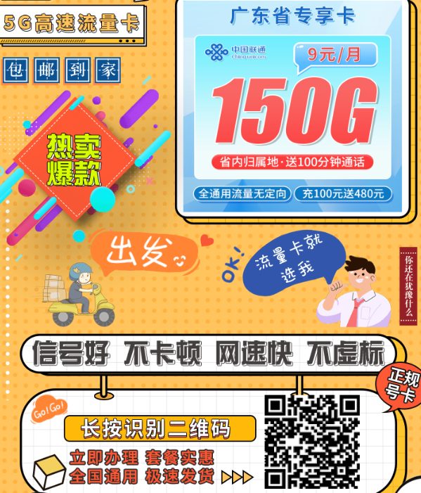 这卡真有点意思。联通广东卡,专给广东人整的。前3个月9块钱,后面长期29元,直接给你150G全国流量+100分钟通话。真别小看这配置,放在现在流量这么贵的年代,