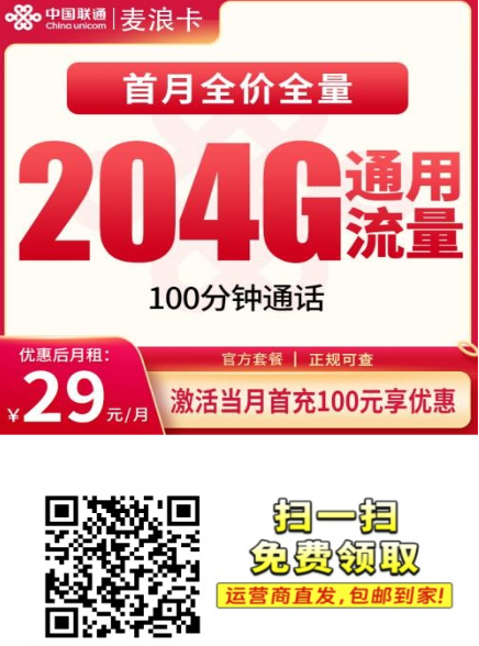 想找一张不涨价、流量多、用得稳的联通卡?这张联通麦浪卡真的是我最近测过里最值得留意的一张。29元月租能用204G全国通用流量+100分钟通话,全程无定向套路,不