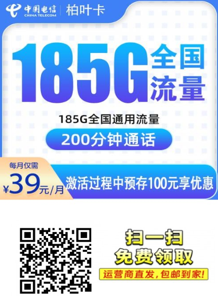 说实话,最近湖南这边电信有点猛。出了个柏叶卡,月租39块,直接给185G全国通用流量+200分钟通话。重点来了,流量当月到账,不限定向,全通用!要是你现在还在用