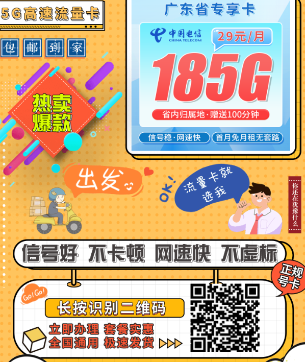 每次有人问我,广东有没有一张便宜又稳定的电信卡?我都会说,有!这张电信广东卡就是专门给广东人准备的。月租29元,流量给到185G,还送100分钟通话。不用上门、