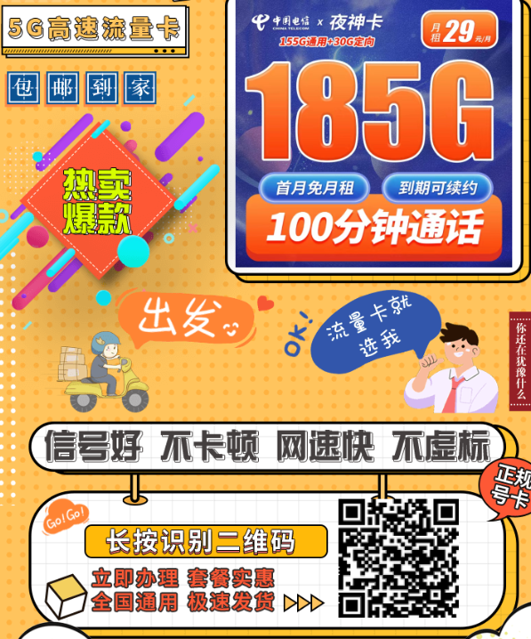 最近有粉丝问我:有没有那种全国都能办、信号稳、长期不涨价的电信卡?新州数码这几天研究下来,还真发现了一张不错的卡叫电信夜神卡。29元月租,185G全国流量+10