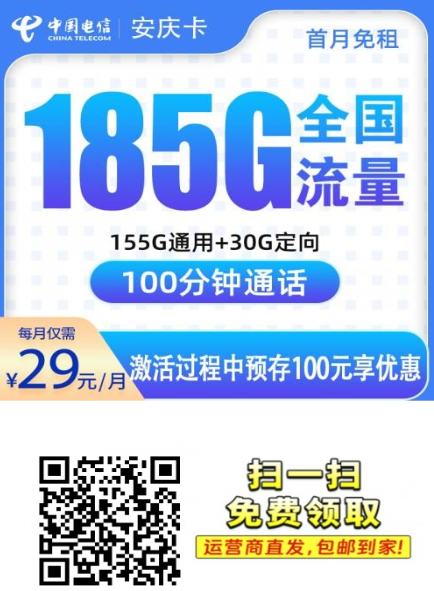 电信安庆卡上架:29元185G+100分钟,这配置在安徽太稳了在安徽,用电信卡图的就是个稳。信号覆盖广、售后靠谱、流量也越来越舍得给。这次新出的电信安庆卡,一看