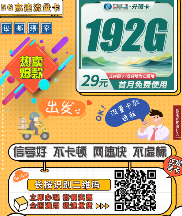 这一两个月,广电动作越来越勤了。继升卿卡之后,又上新了一张广电升望卡。这次主打的,是“首月免租 + 192G全国通用流量 + 本地号段”。重点是全国都能发,优惠