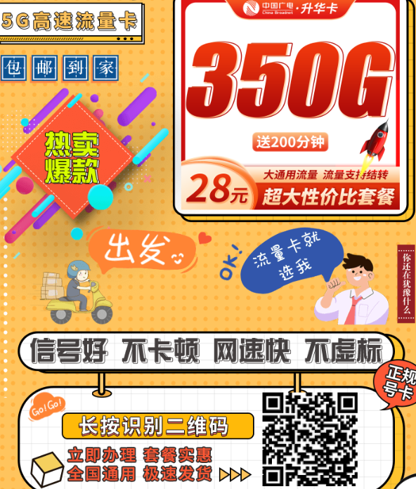 这张卡最大的特点就是“量给到足”。月租只要28元,却能拿到350G全国通用流量,是真正能用到爽的套餐。语音通话直接关闭,彻底为纯流量用户打造。对于经常刷视频、开