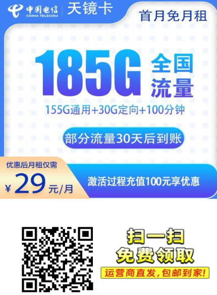 电信天镜卡 29 元 185G 全国流量 + 100 分钟通话详解29 元全国套餐 | 长期稳定 | 自主激活 | 无合约期现在市面上 29 元档的流量卡越来越