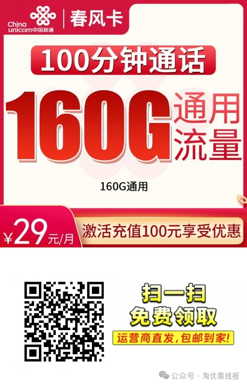 喜欢联通的用户,大家好,现在推介联通春风卡,其价格比较亲民,这个套餐适合流量需求大、通话需求适中的用户,尤其是长期使用的话,优惠较大。春风卡 29元 | 160G流量 + 100分钟通话
