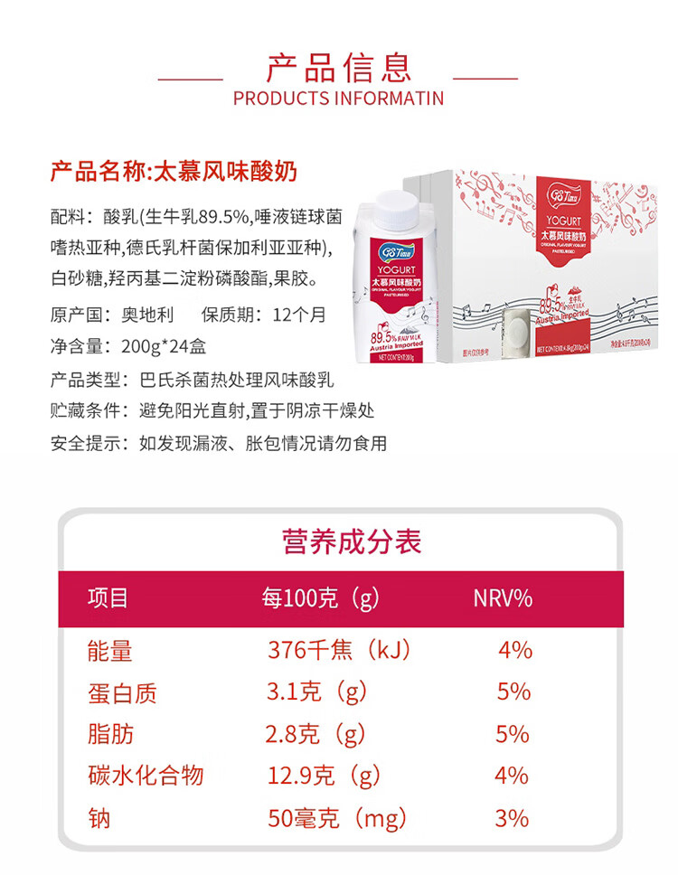太慕 奥地利进口风味酸奶200g*24盒 生牛乳发酵 常温原味 酸奶进口