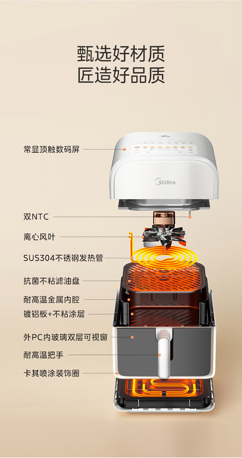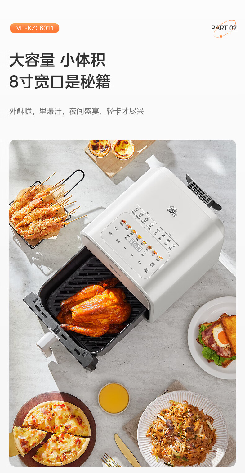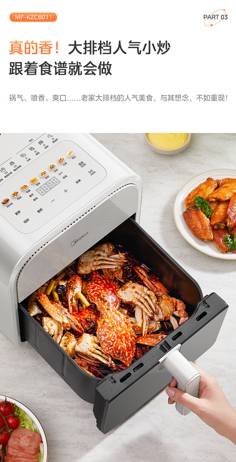 美的(Midea)炎烤空气炸锅触控免翻面 环火上下双热源 家用宽口实用大容量6L 可视大视窗金属内腔 MF-KZC6011 【环火炎烤】 6L