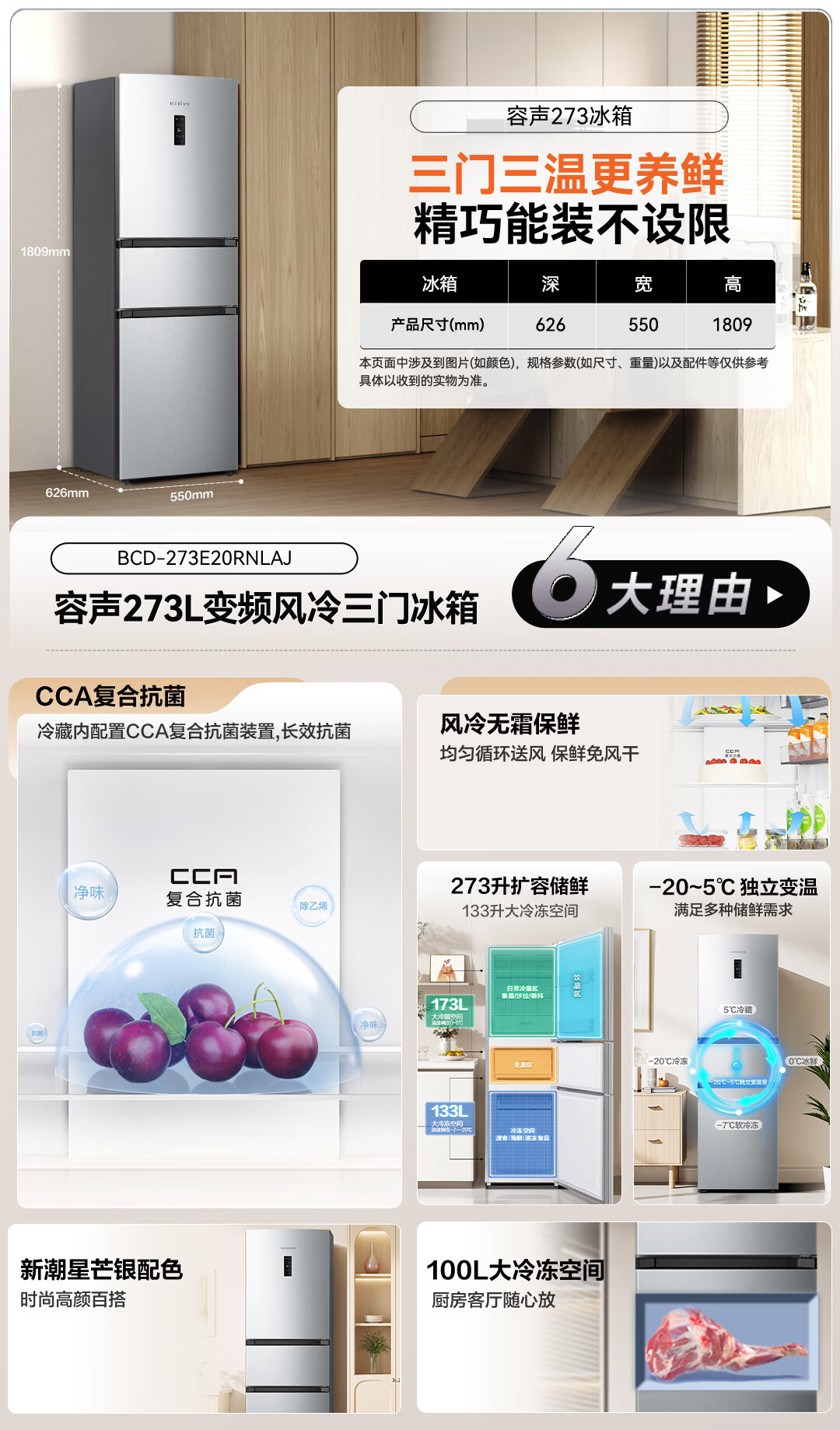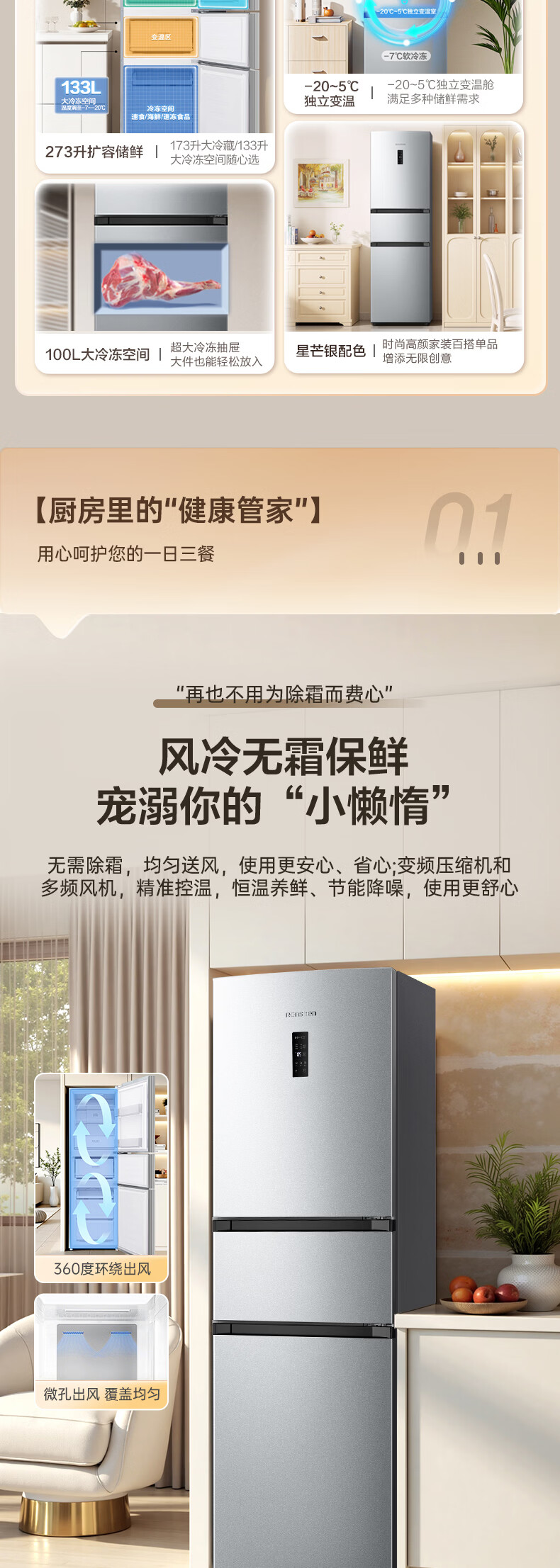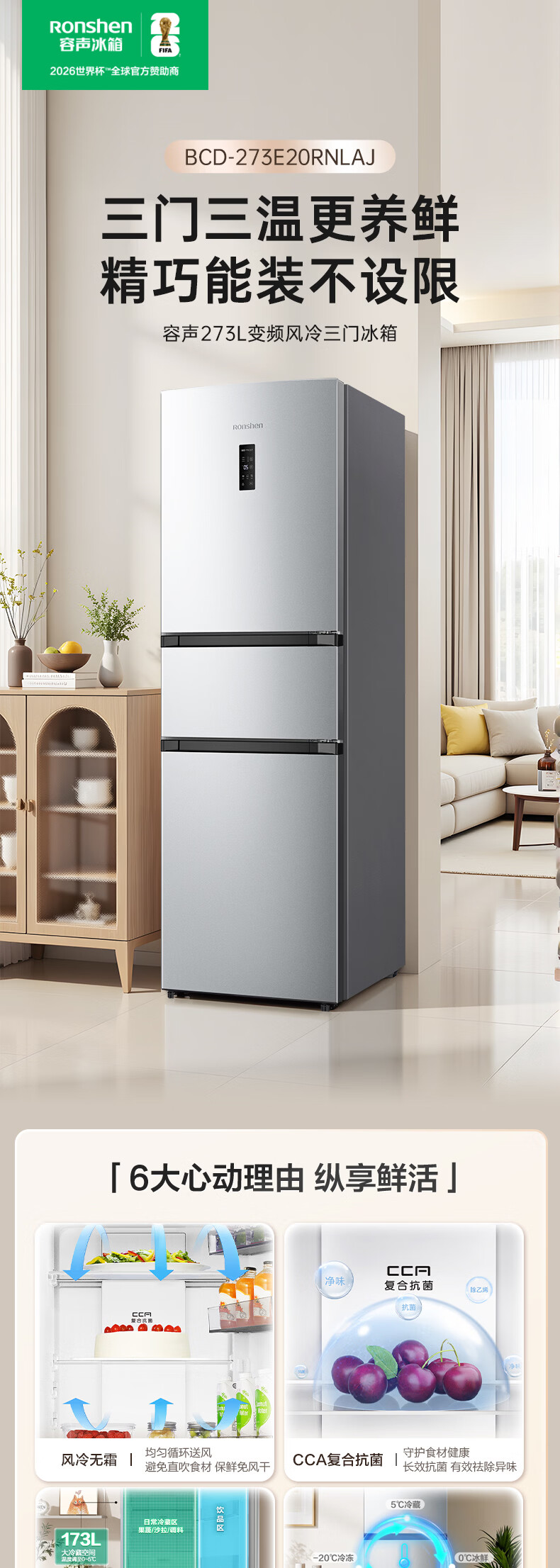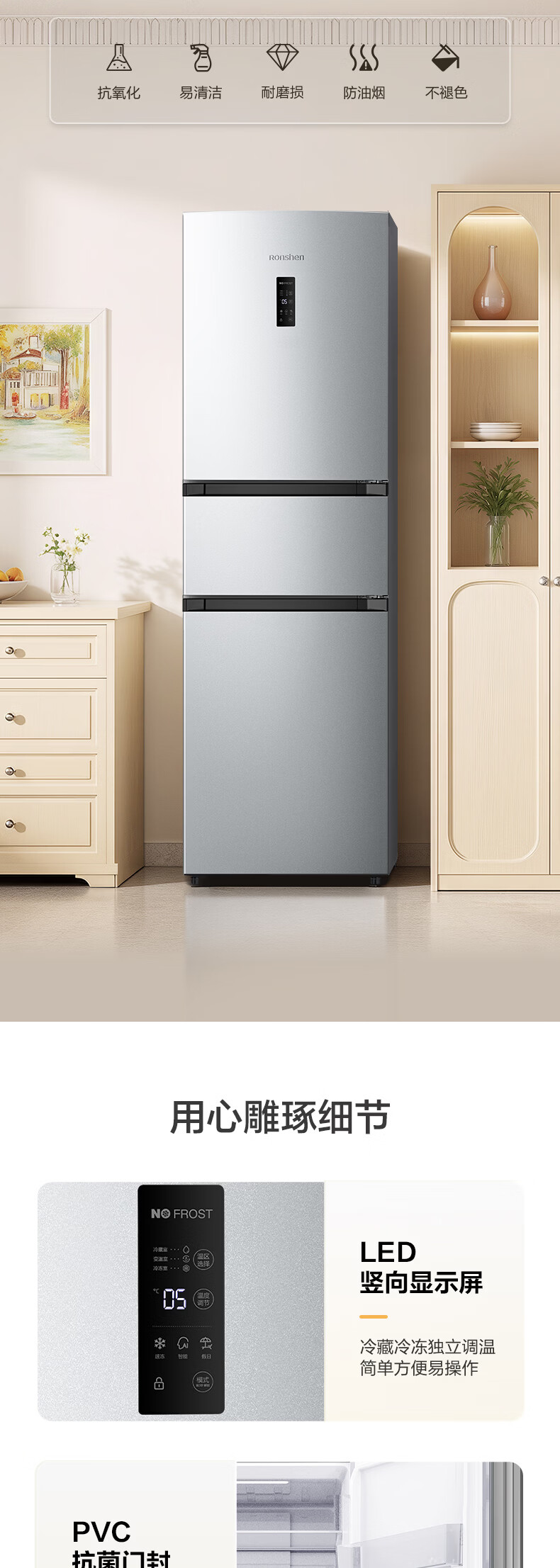容声273L三开门小冰箱小型家用超薄风冷无霜一级能效变频小户型出租房换新BCD-273E20RNLAJ国家补贴