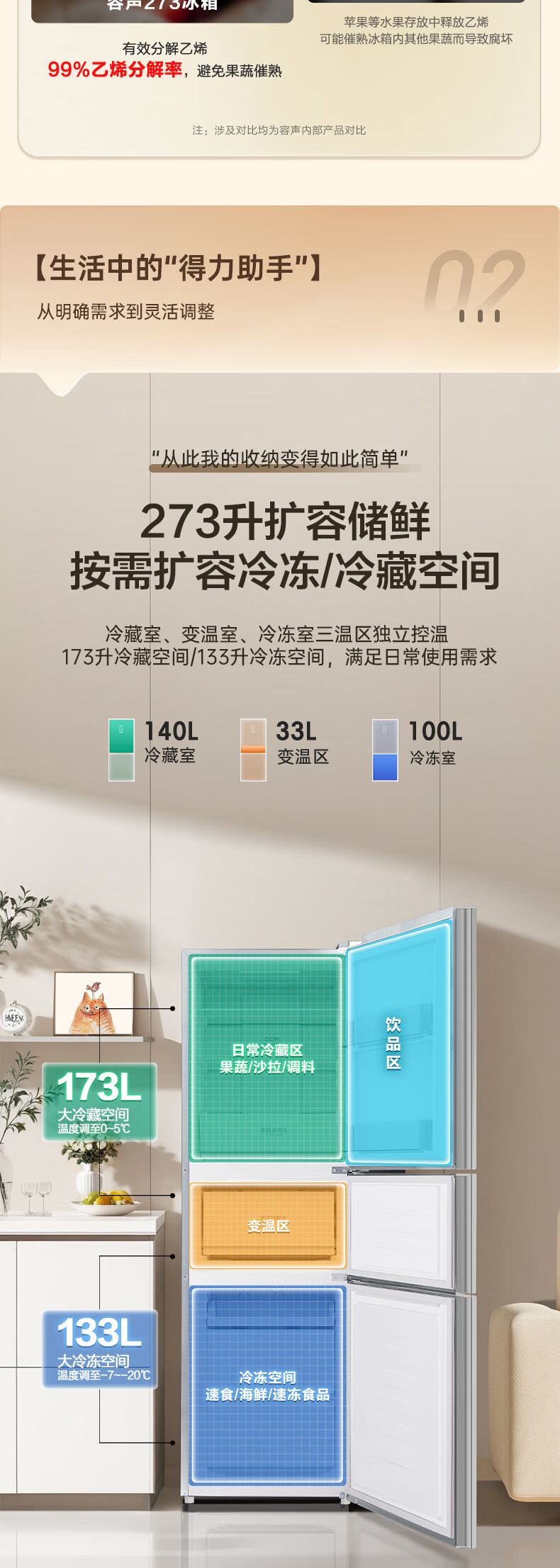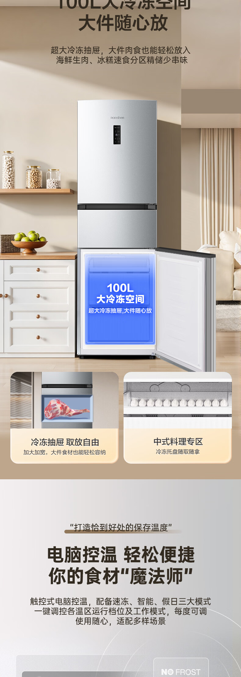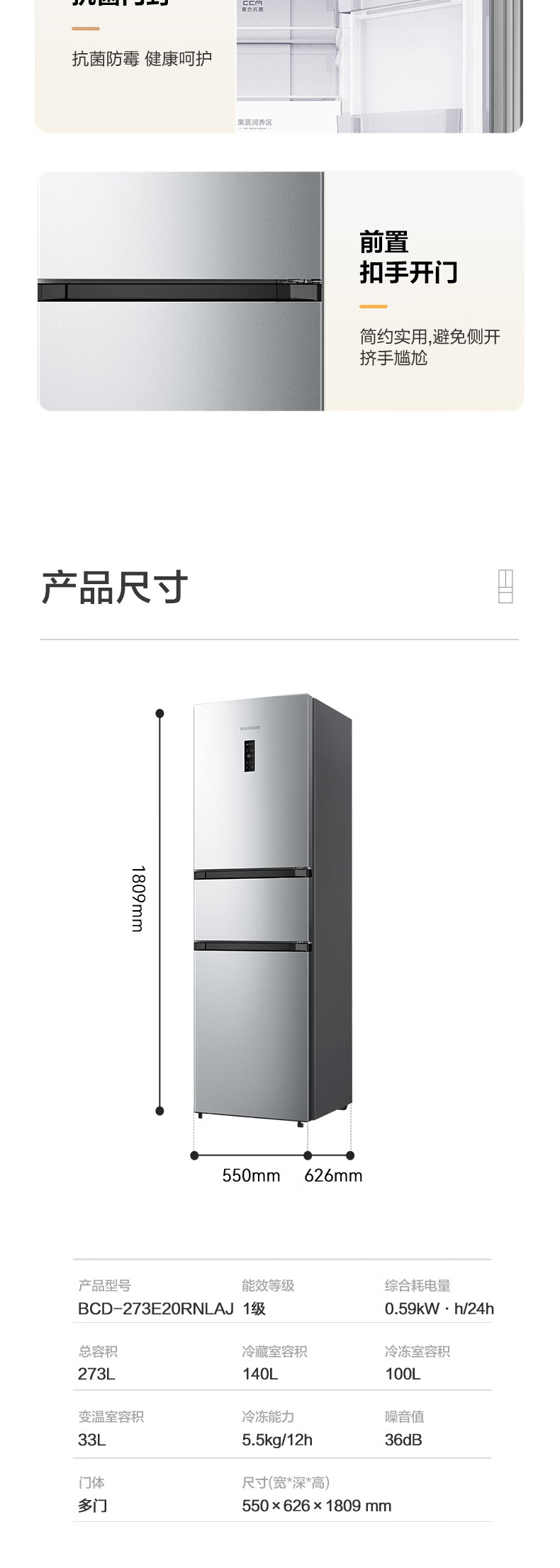容声273L三开门小冰箱小型家用超薄风冷无霜一级能效变频小户型出租房换新BCD-273E20RNLAJ国家补贴