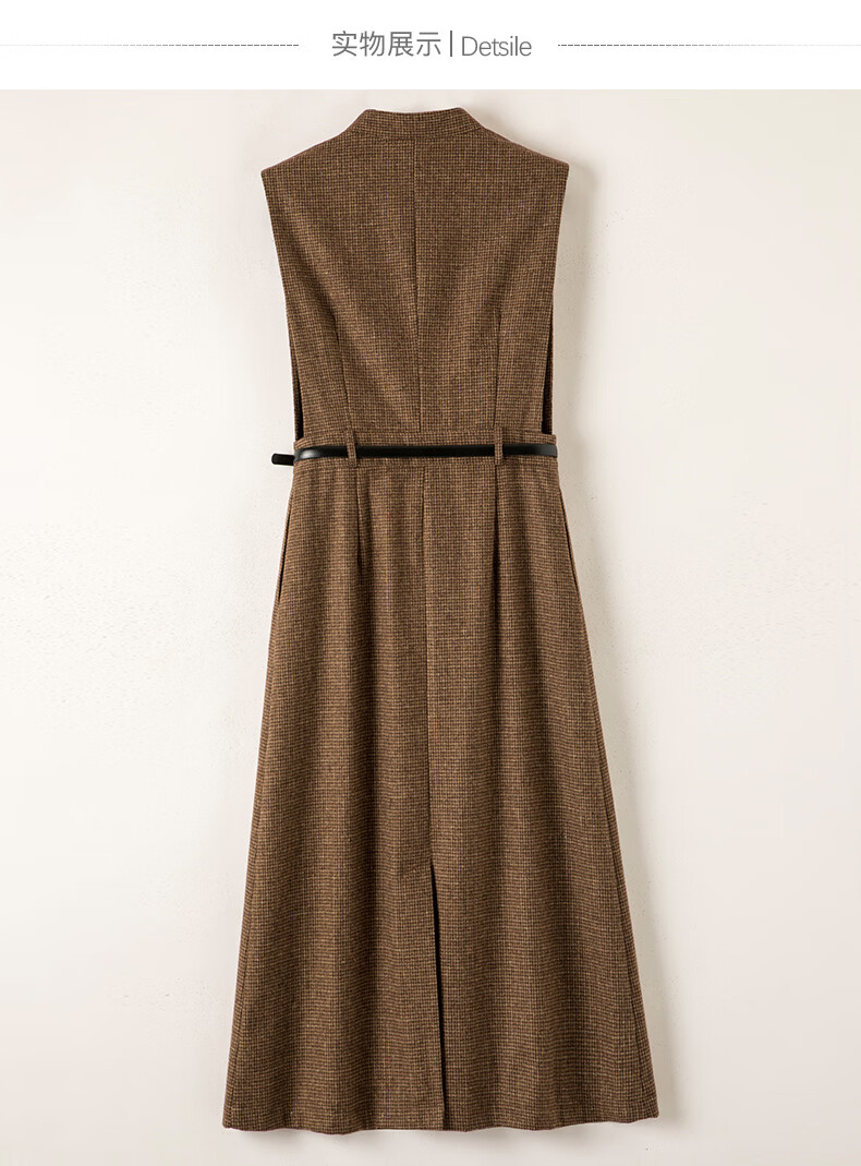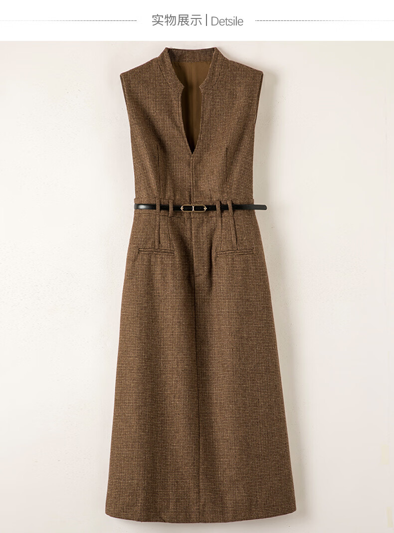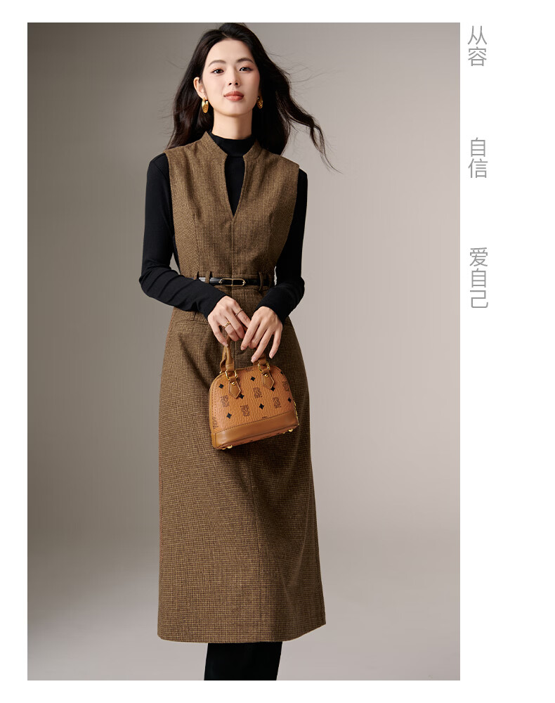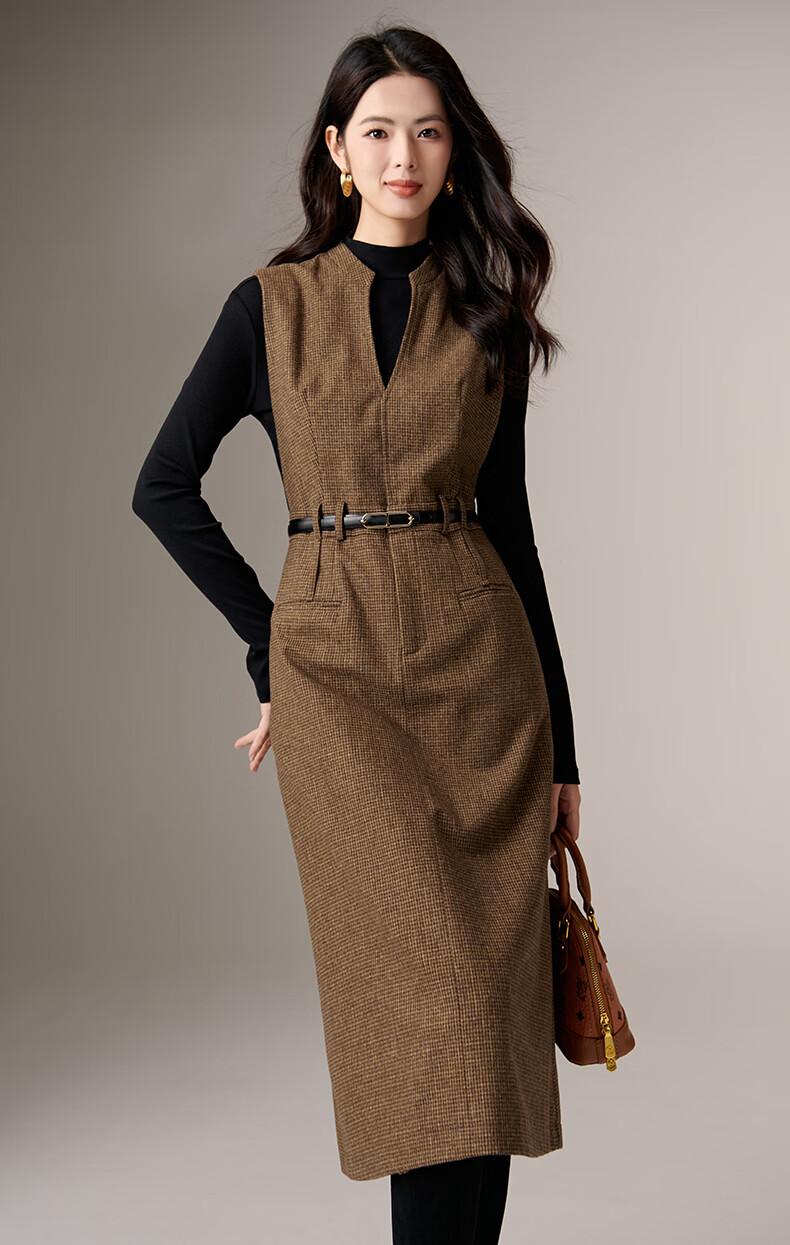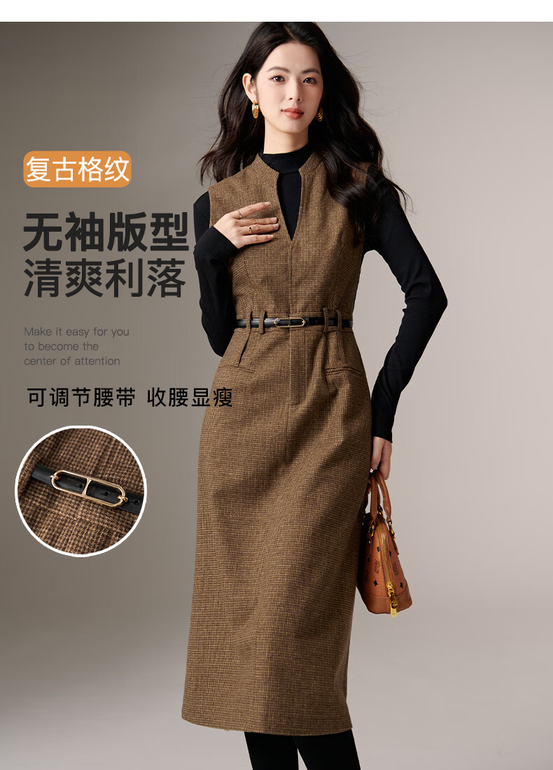 晚白【新品】冬款时尚复古格纹羊毛裙挺括修身优雅百搭无袖连衣裙 深咖色 L