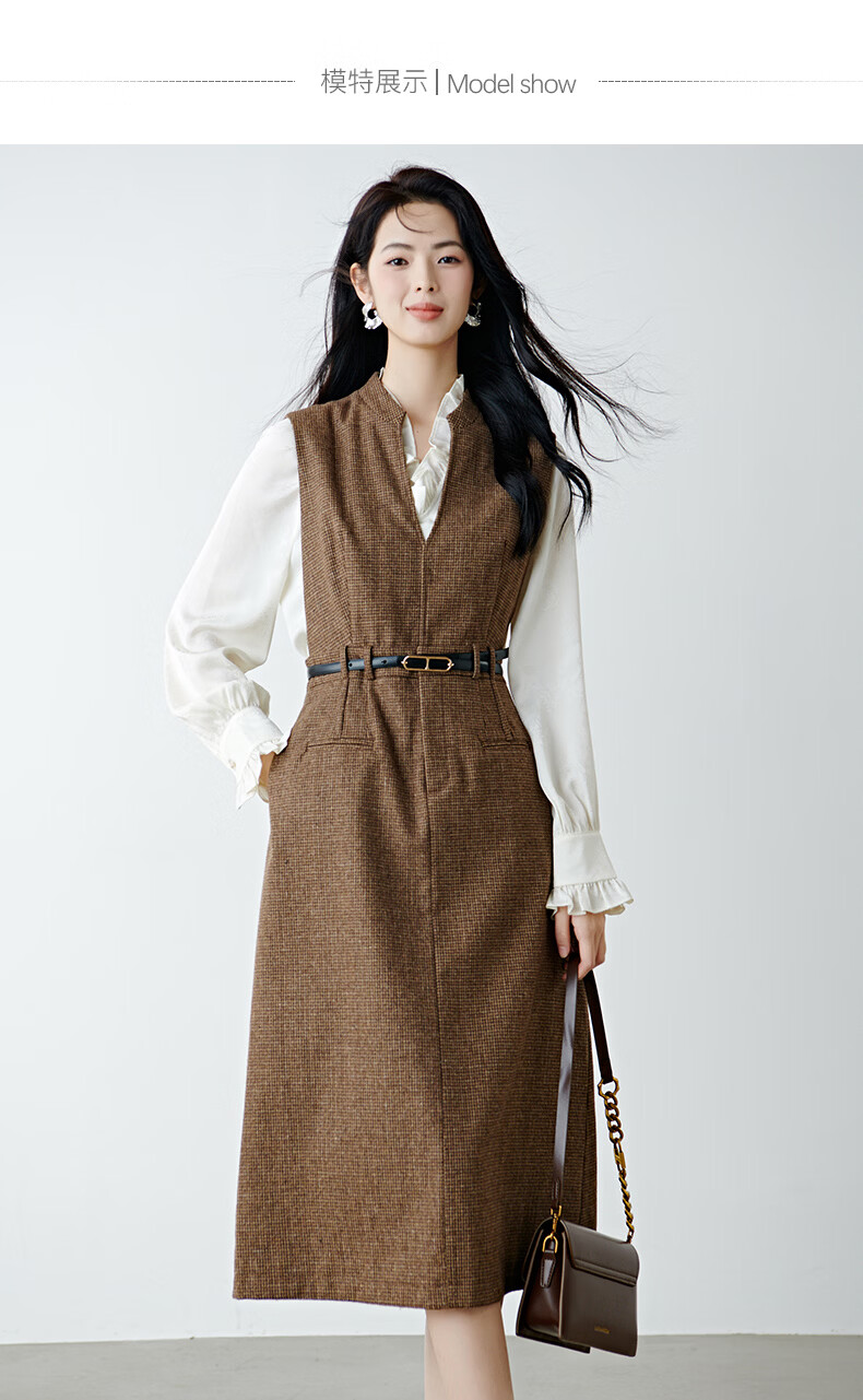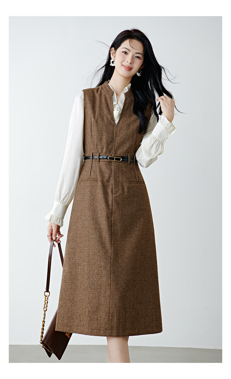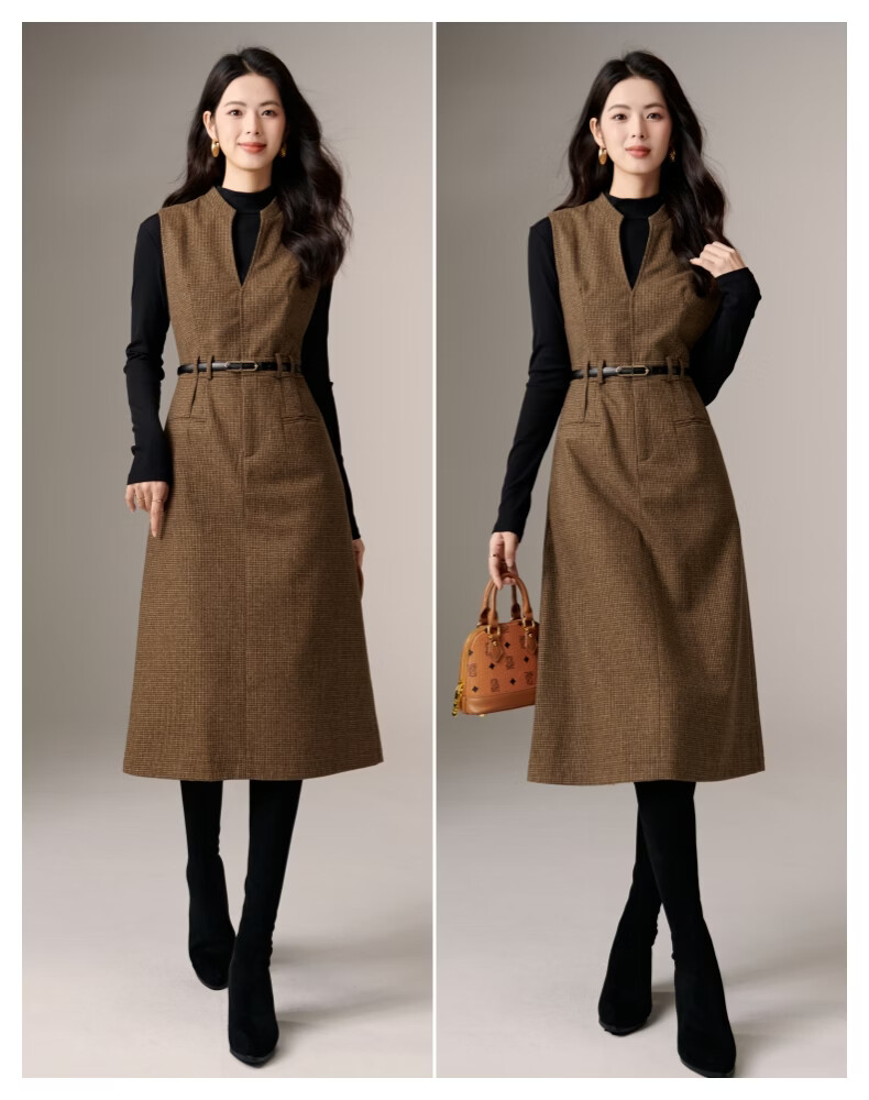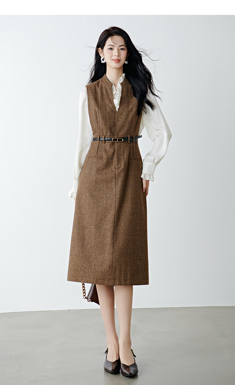 晚白【新品】冬款时尚复古格纹羊毛裙挺括修身优雅百搭无袖连衣裙 深咖色 L