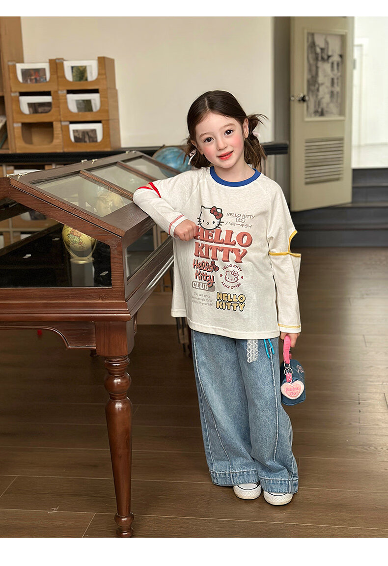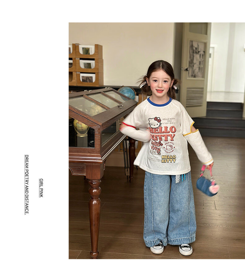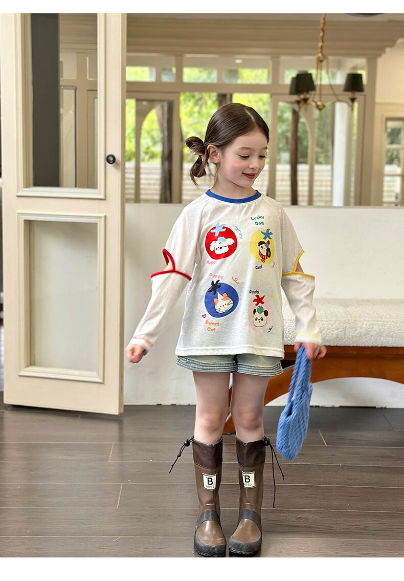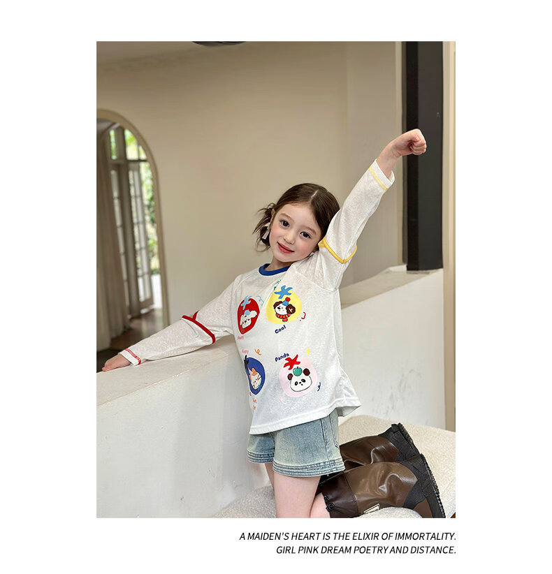 栀了成长记女童装韩版可爱短袖上衣2026春季儿童新款百搭圆领T恤 牛仔裙 120 cm