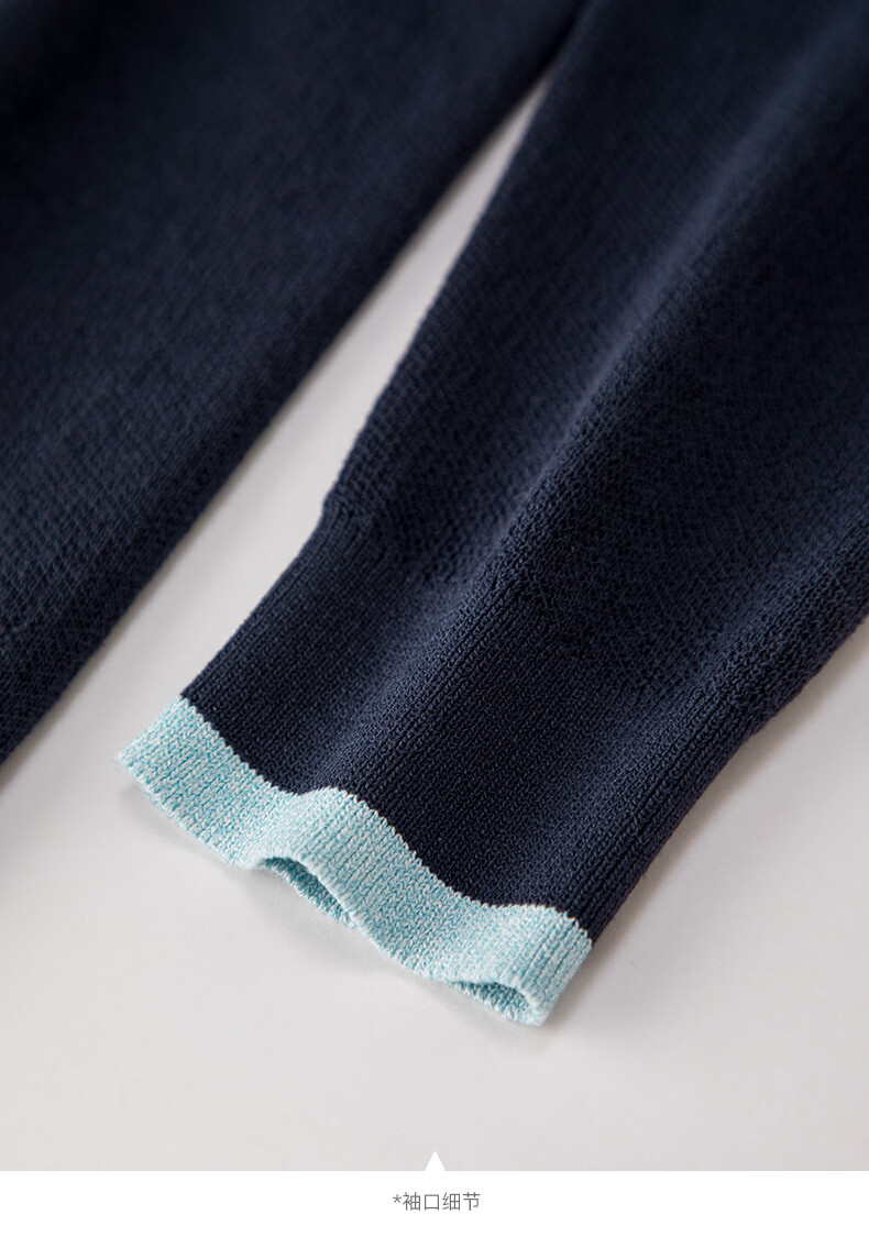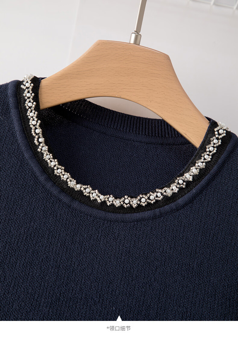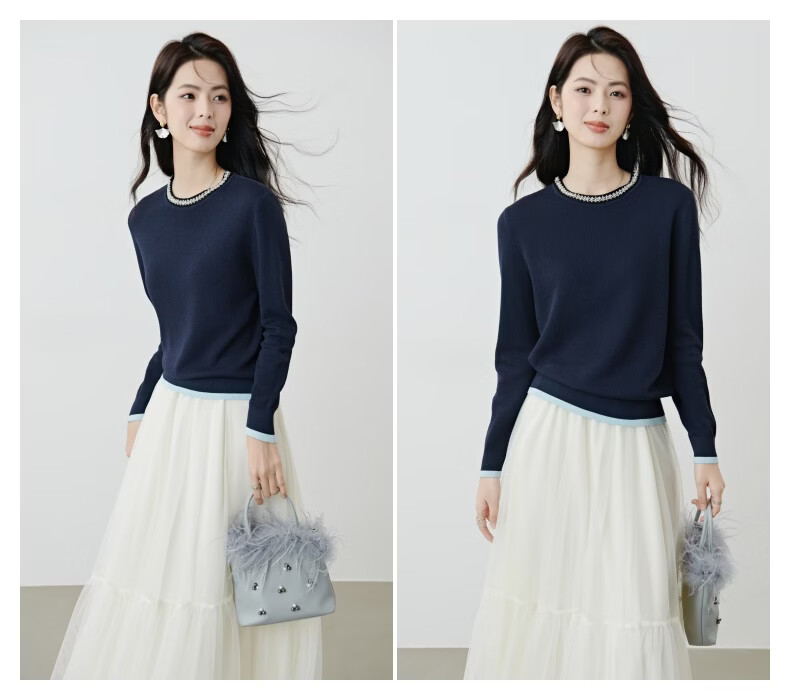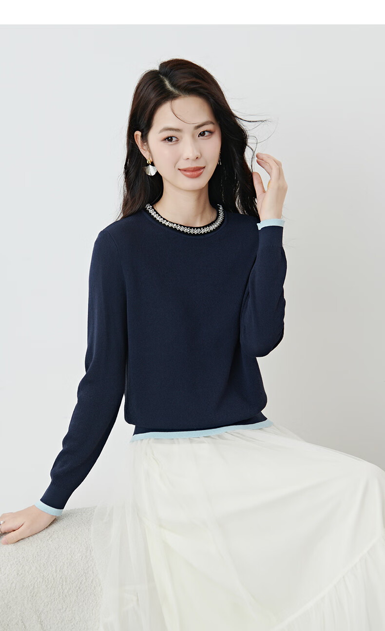 晚白2026年春款时尚撞色钉珠圆领上衣亲肤显白休闲针织衫女 深蓝色 S