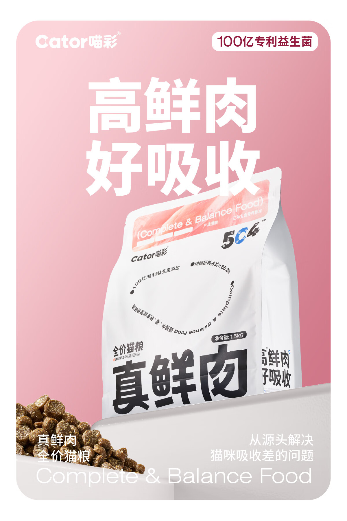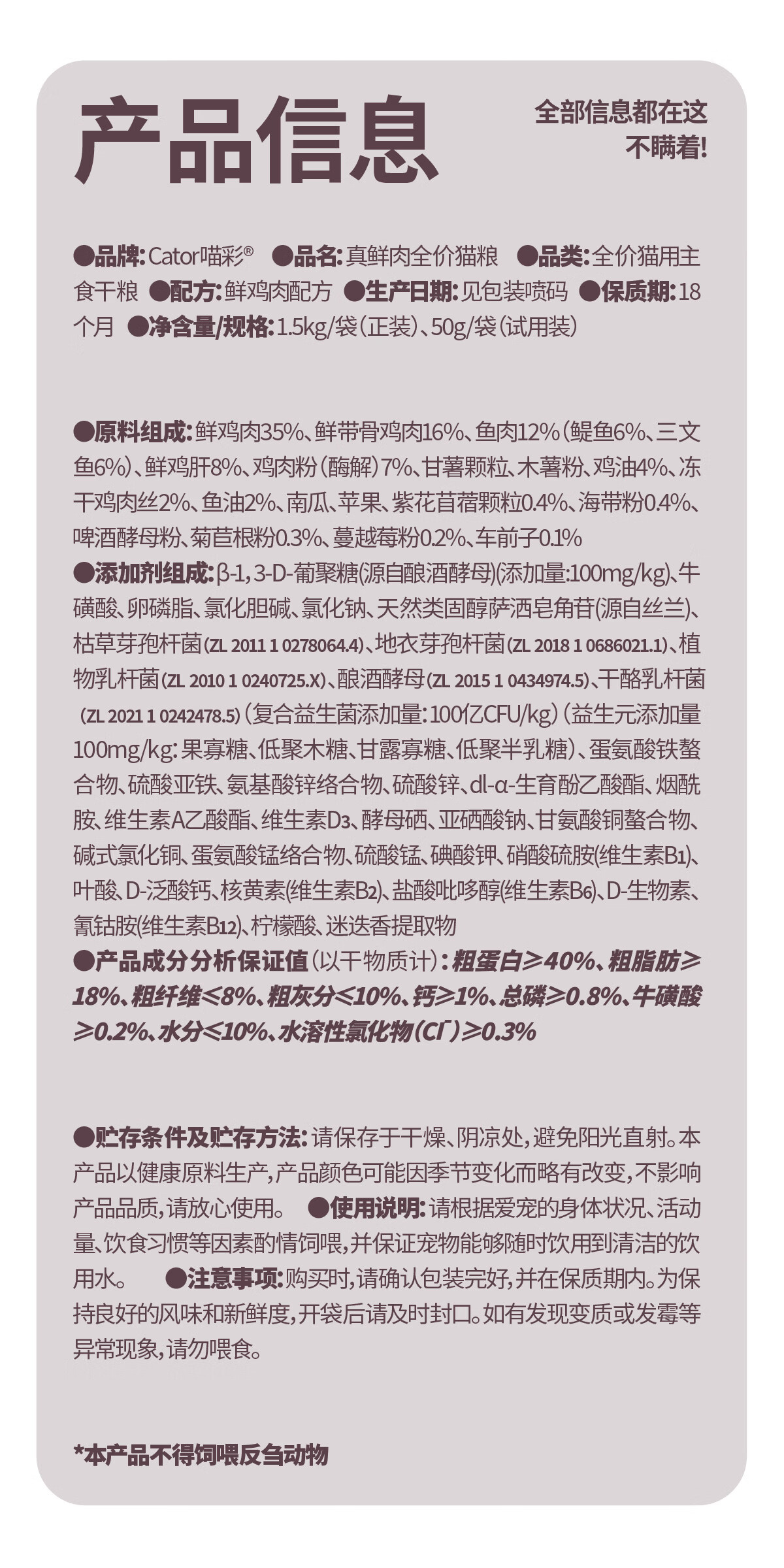 喵彩鲜肉益生菌无谷鸡肉猫粮成幼猫高蛋白通用营养1.5kg 真鲜肉益生菌猫粮1.5kg*1包 赠送1包50g试吃装