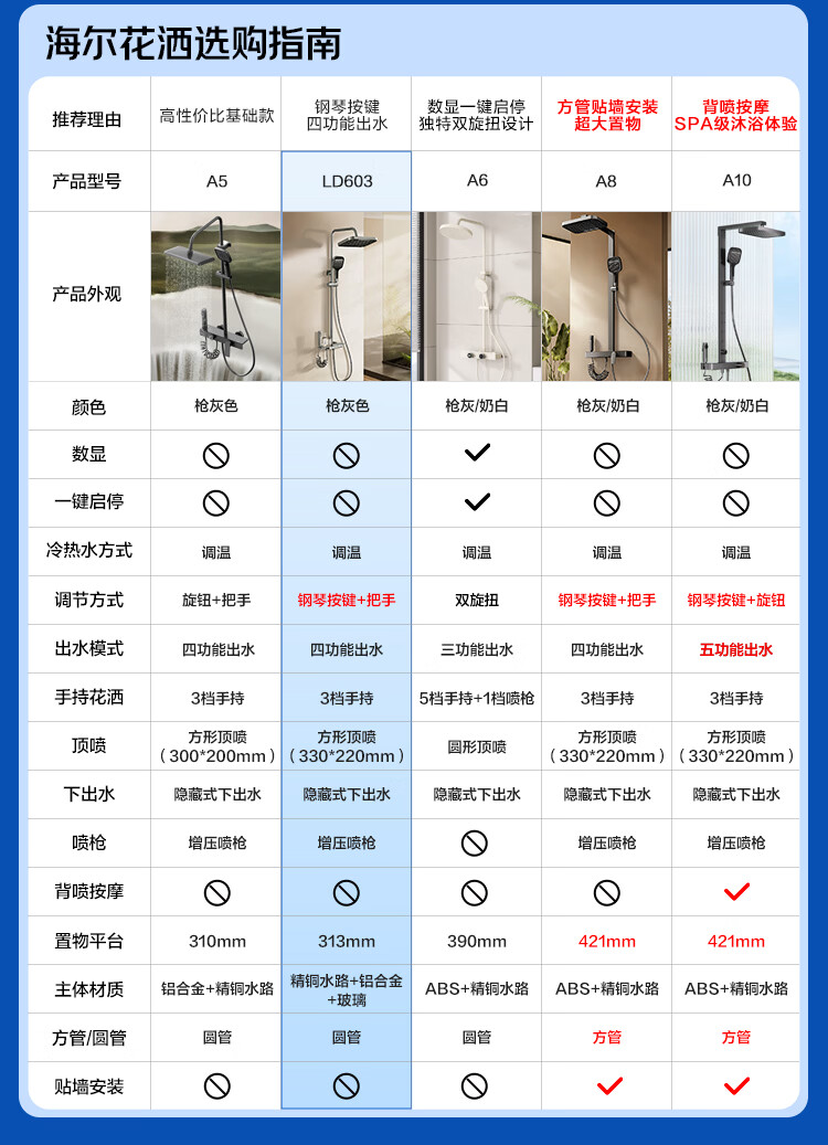 海尔(Haier)淋浴花洒套装 精铜主体 大置物平台 四功能淋浴全套一体式 【琴键升级四功能】L603 【免费安装】