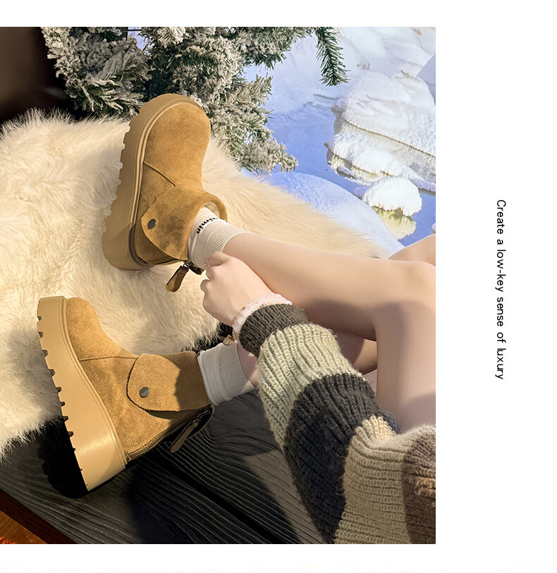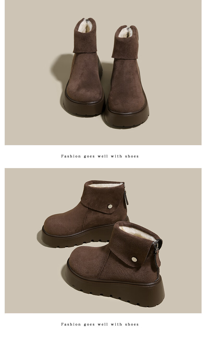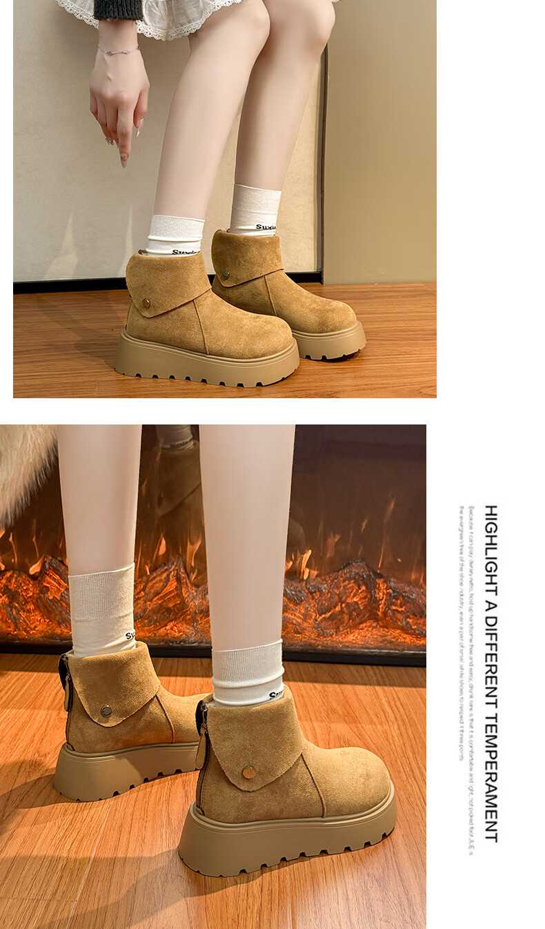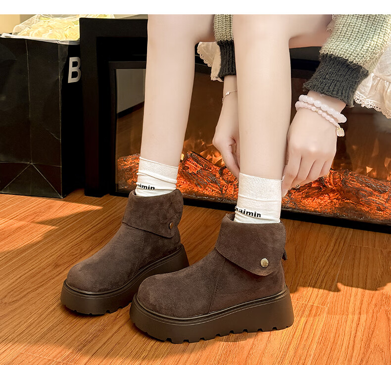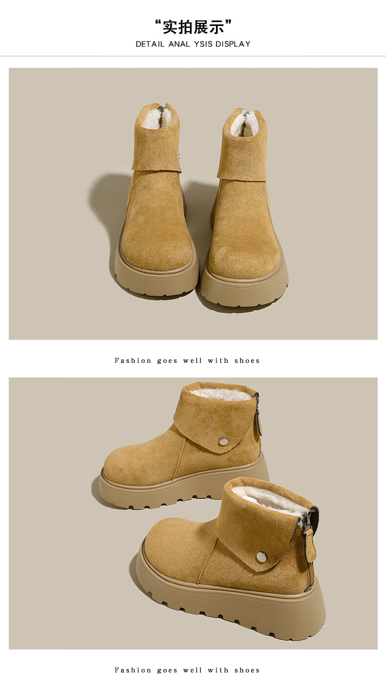 稻草人(MEXICAN)厚底增高皮毛一体雪地靴女2026秋冬季新款加绒加厚保暖棉鞋短靴子 卡其色 35