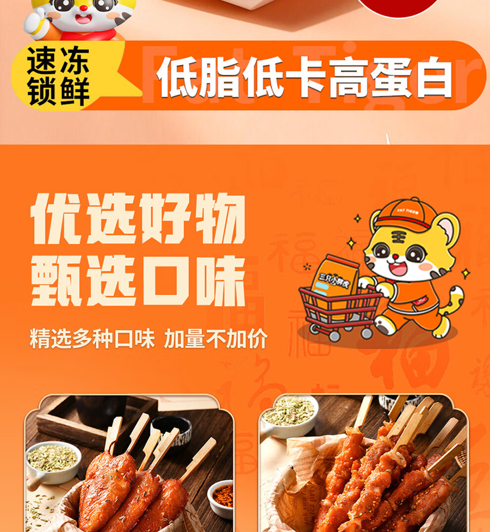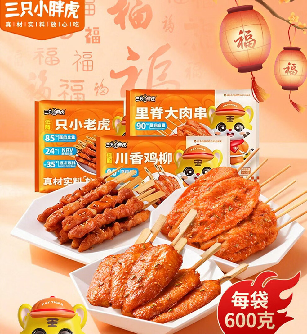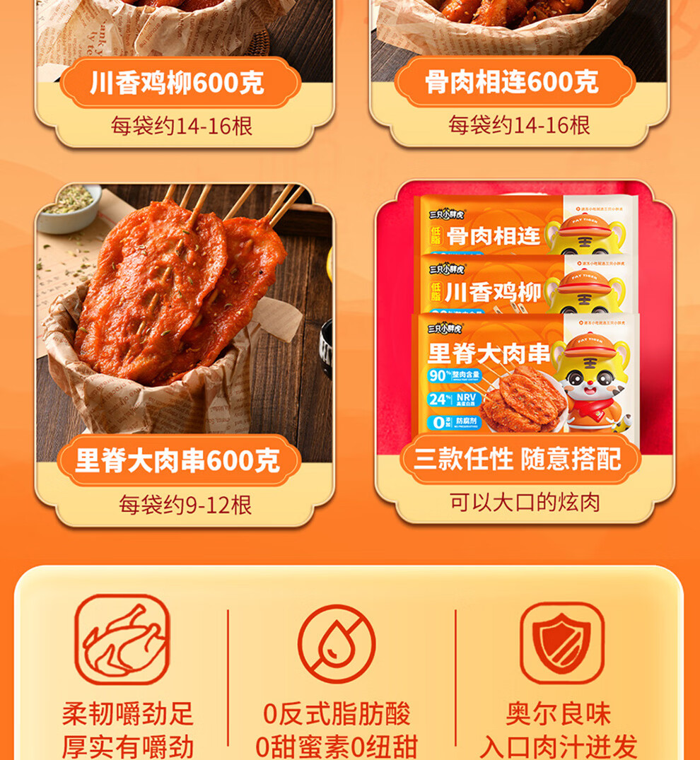 三只小胖虎里脊肉串川香鸡柳骨肉相连鸡胸肉冷冻半成品食材家庭装组合套餐 【骨肉相连+里脊大肉串+川香鸡柳】各600克共3袋