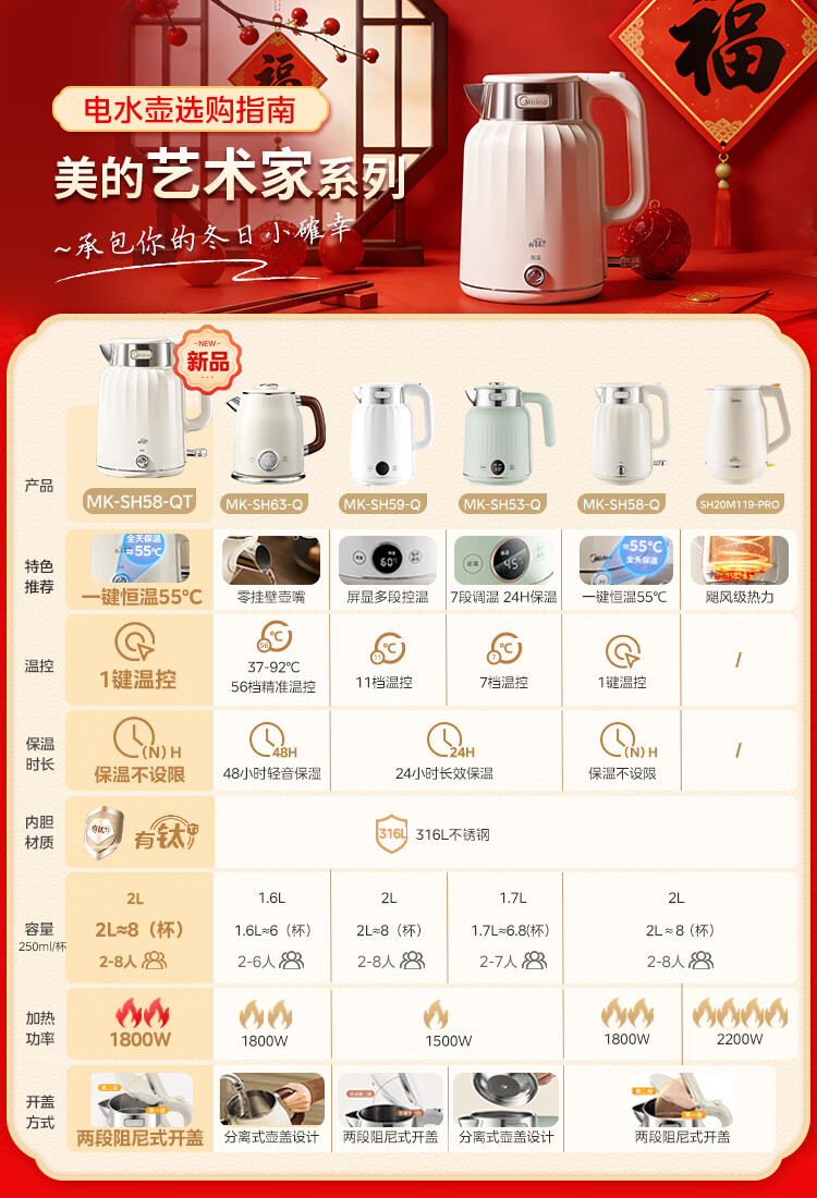 美的(Midea)电热水壶恒温烧水壶自动断电婴儿调奶2L大容量母婴级316L不锈钢无缝一体内胆年货 SH58-Q