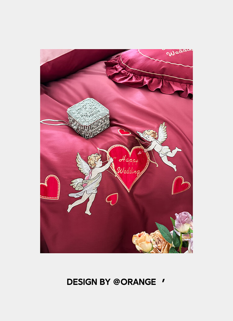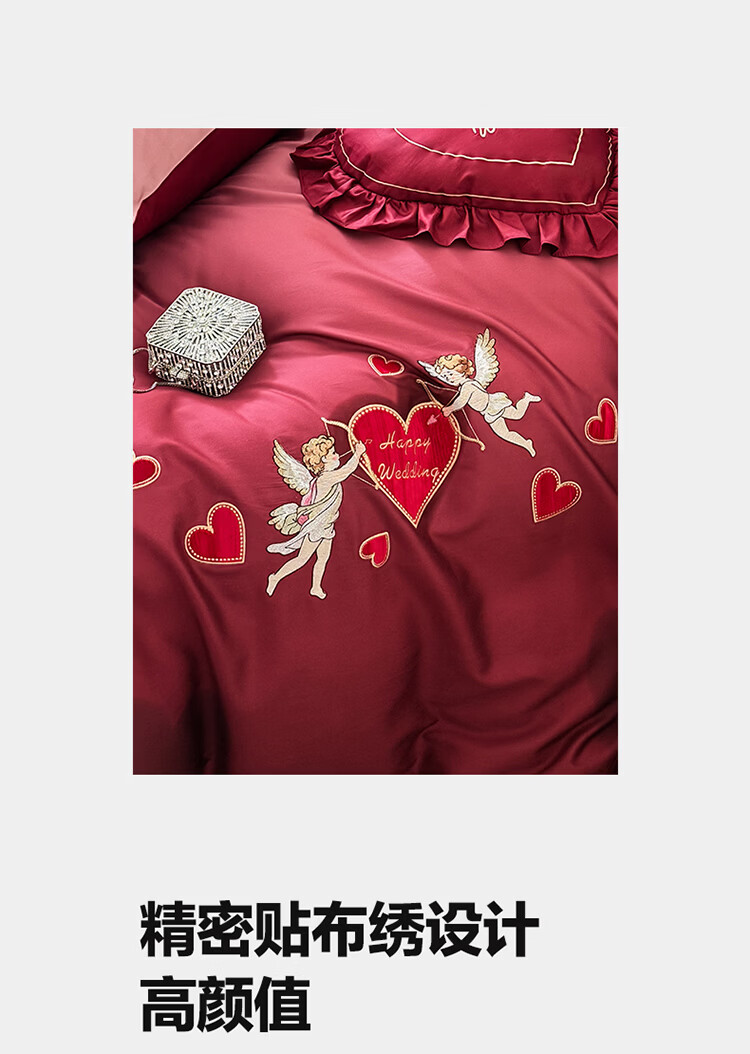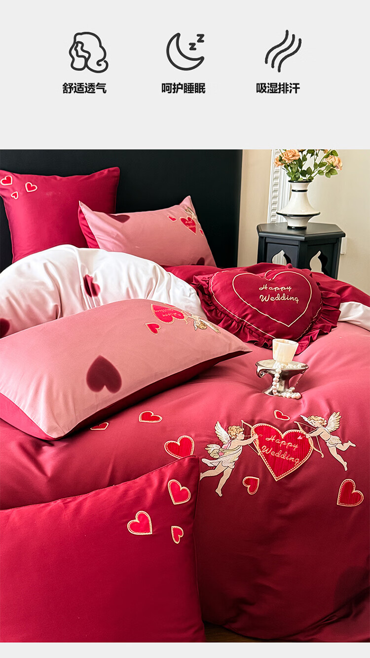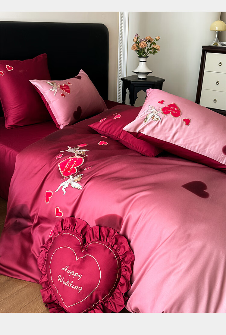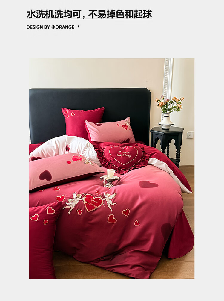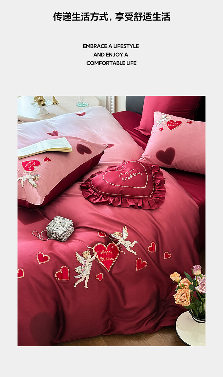 ROLAND LIVE高级感长绒棉婚庆四件套红色喜庆结婚全棉被套床单床上用品 WL长绒棉婚庆四件套-爱心天使红 1.5-1.8米床 |【被套200*230cm】