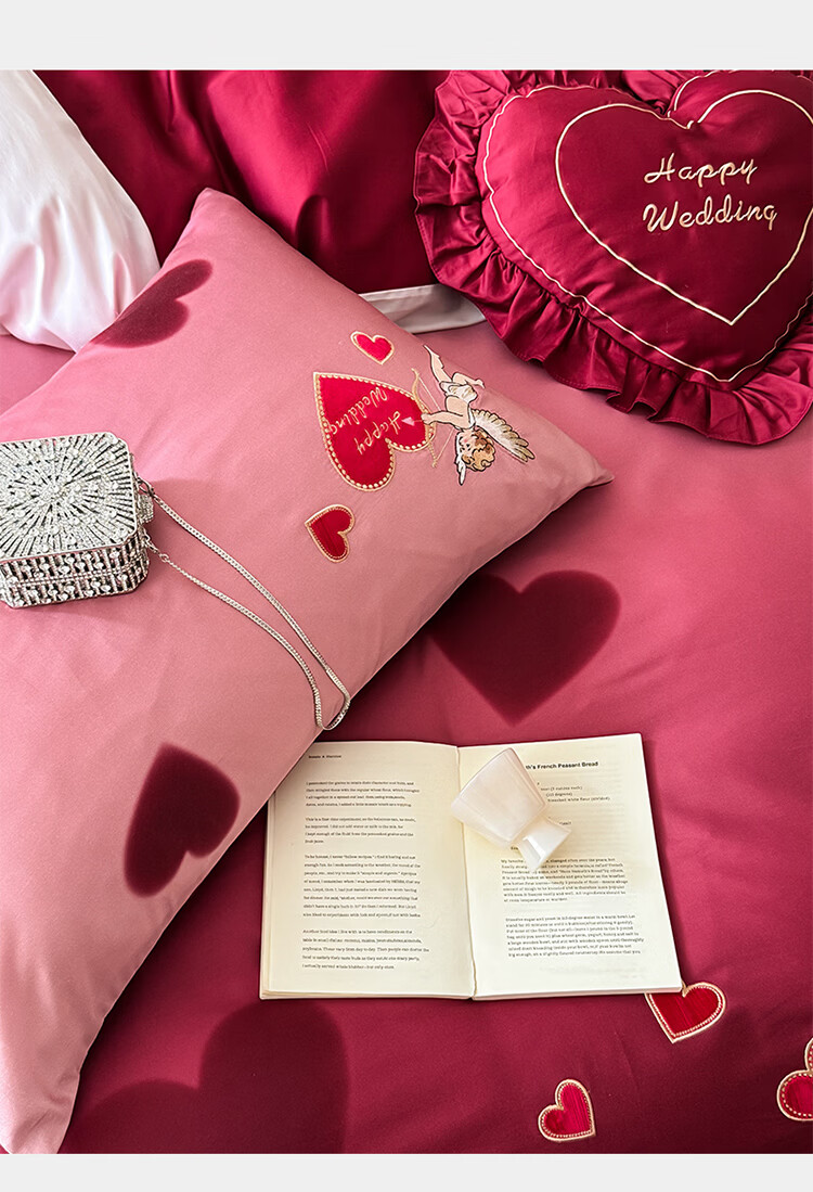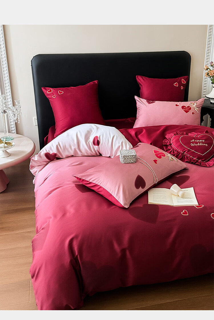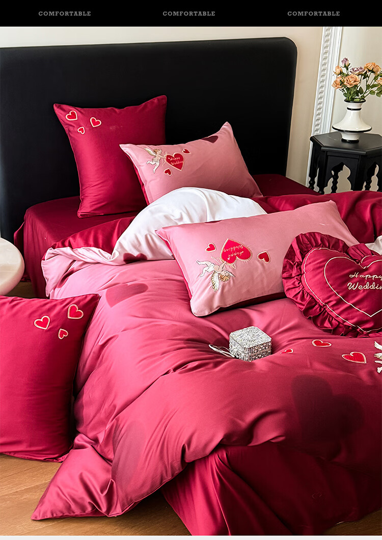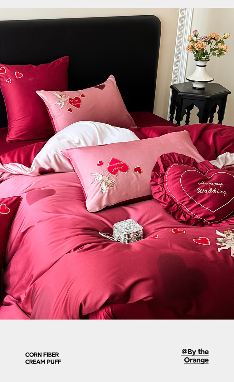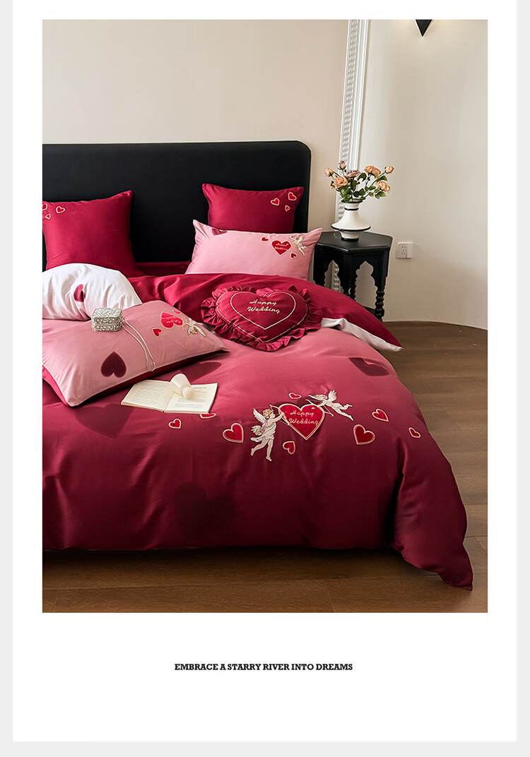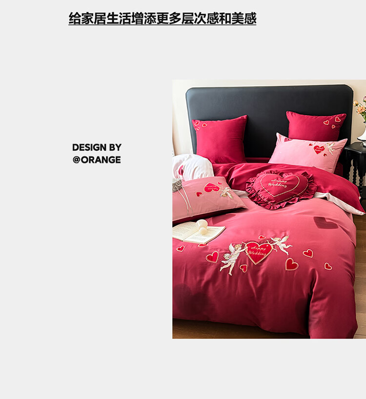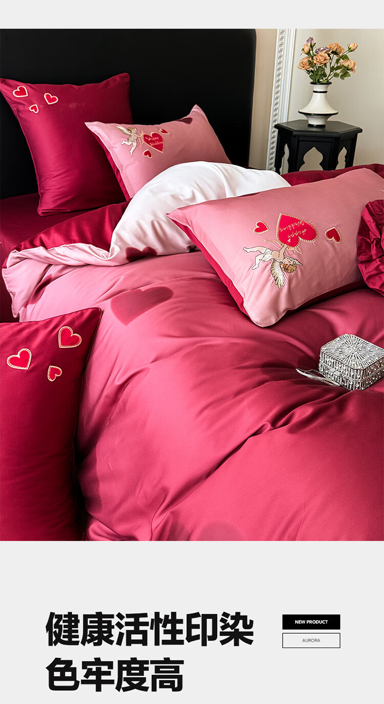 ROLAND LIVE高级感长绒棉婚庆四件套红色喜庆结婚全棉被套床单床上用品 WL长绒棉婚庆四件套-爱心天使红 1.5-1.8米床 |【被套200*230cm】