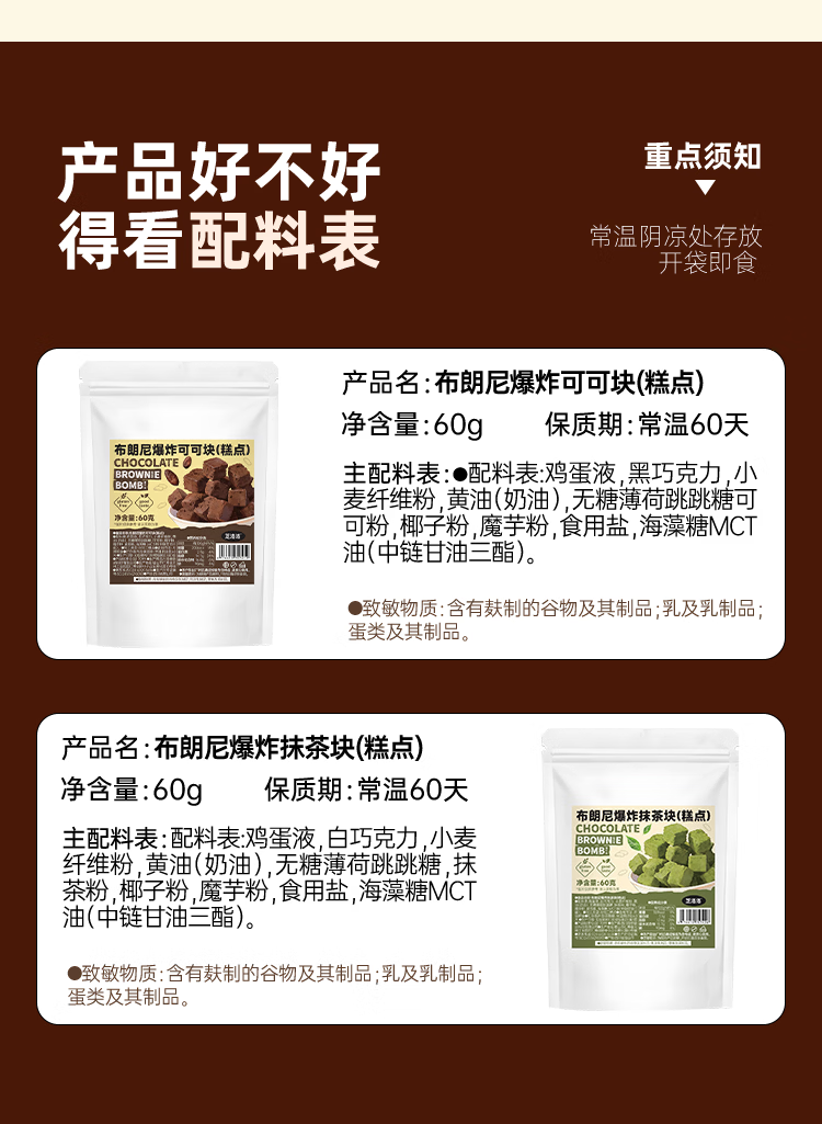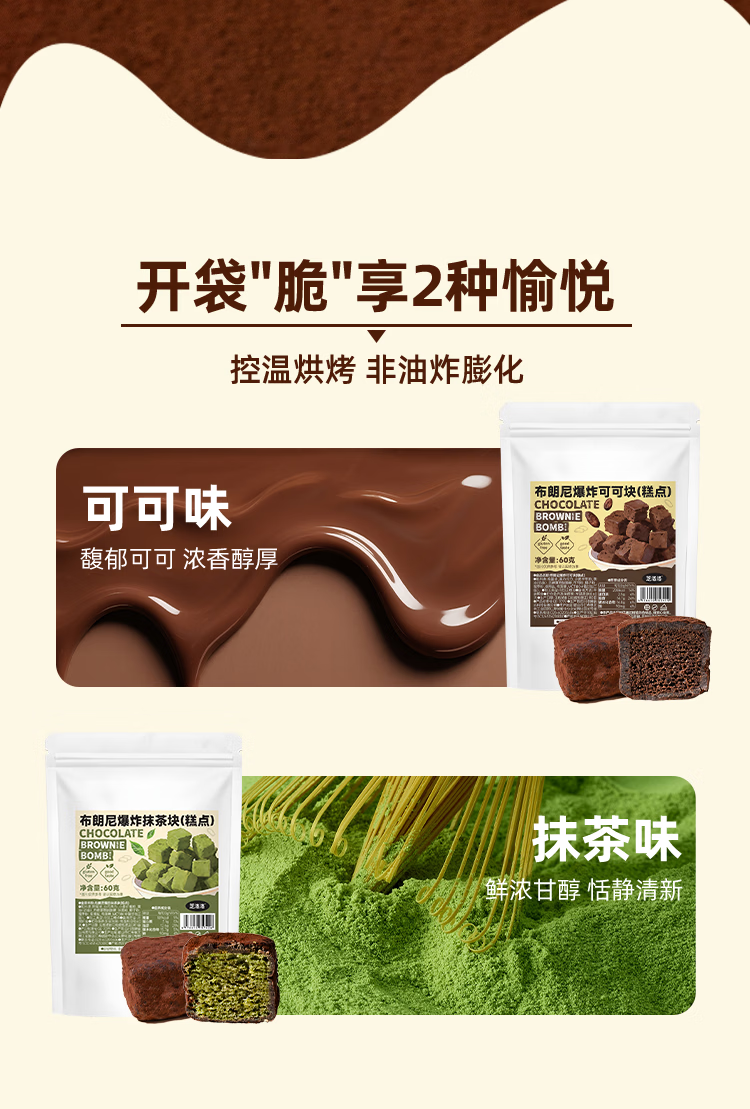 芝洛洛布朗尼爆炸可可块巧克力脆蛋糕解馋追剧必备零食60g/袋 【布朗尼可可块】60g*4袋(可可2+抹茶2)