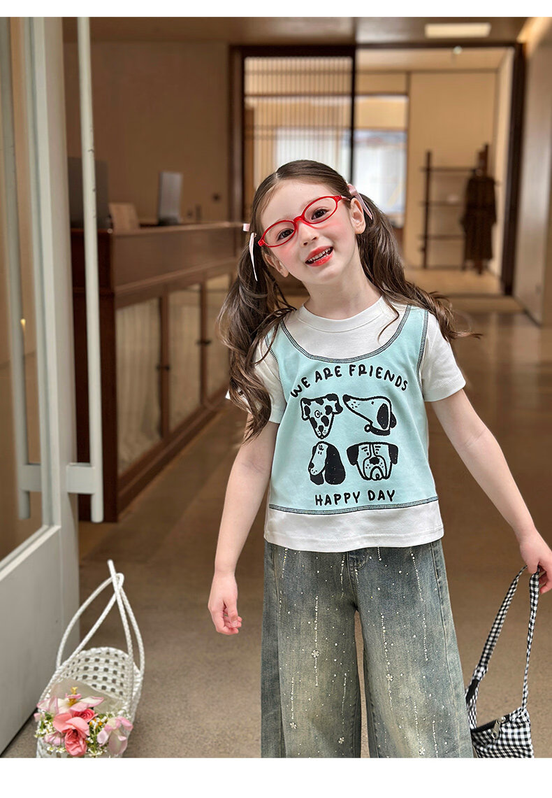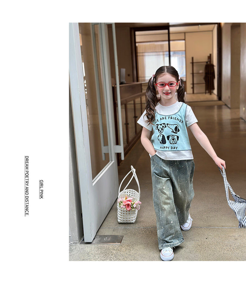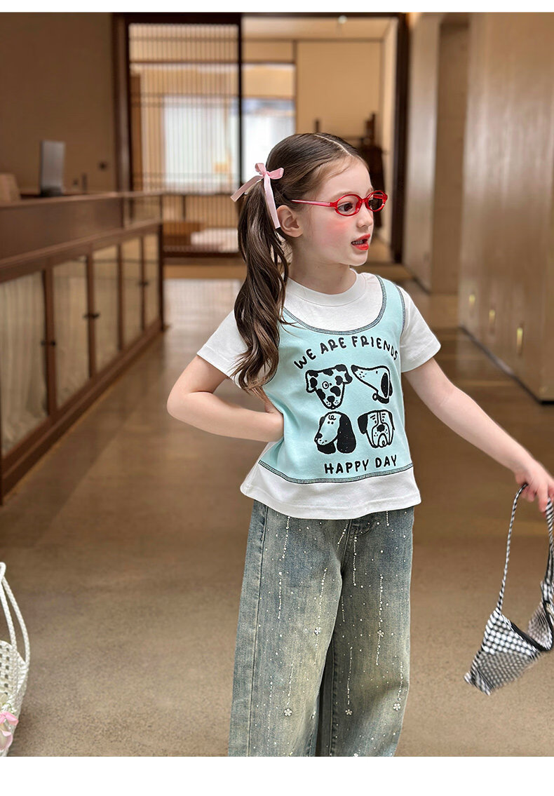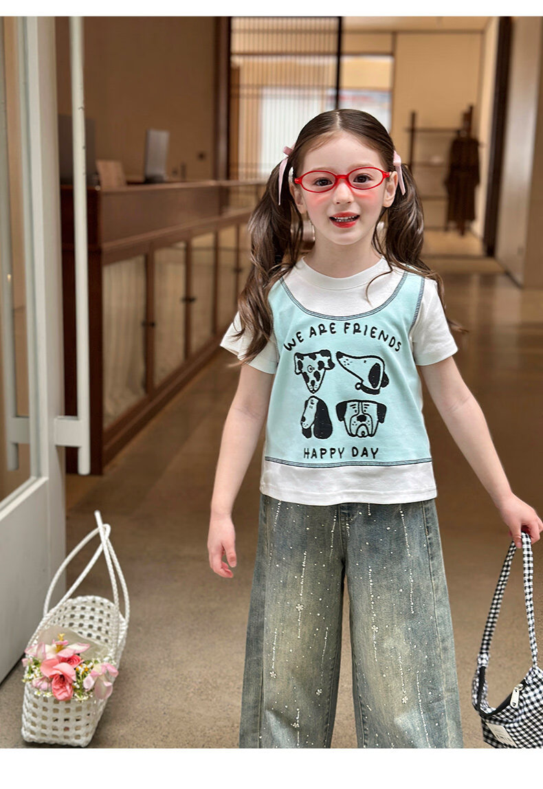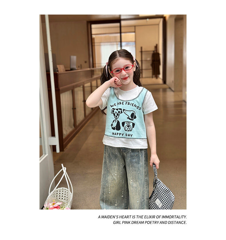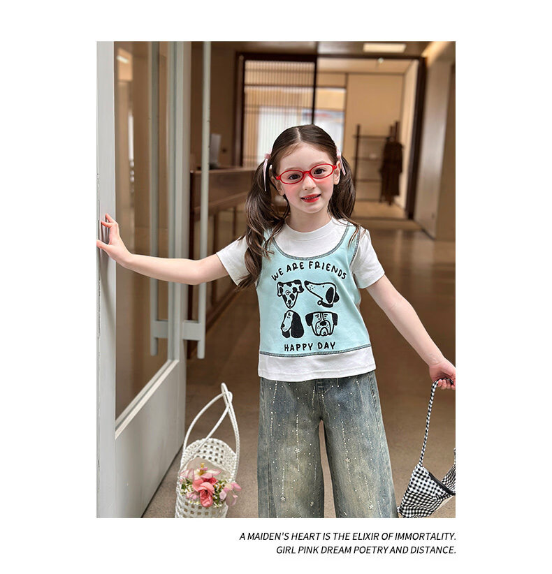 栀了成长记童装女童韩版假两件宽松上衣2026春季儿童可爱印花T恤 牛仔裤 100 cm