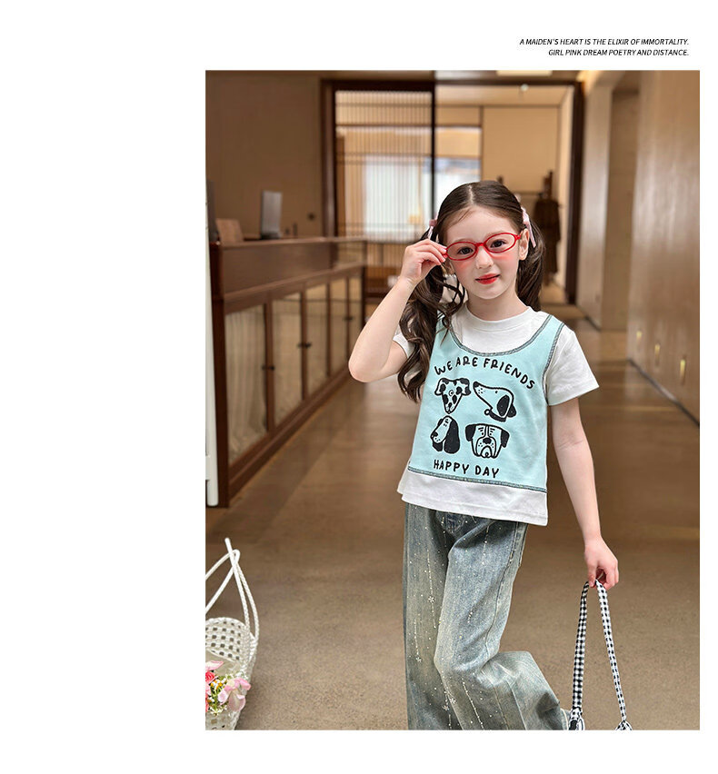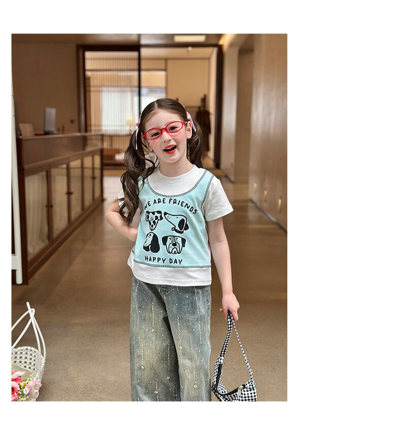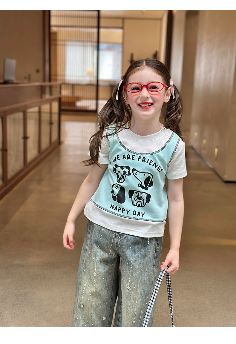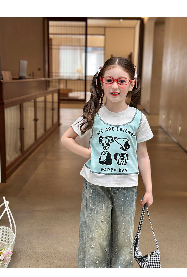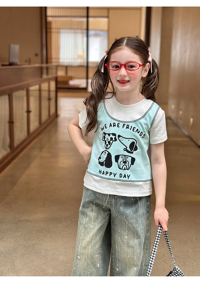 栀了成长记童装女童韩版假两件宽松上衣2026春季儿童可爱印花T恤 牛仔裤 100 cm