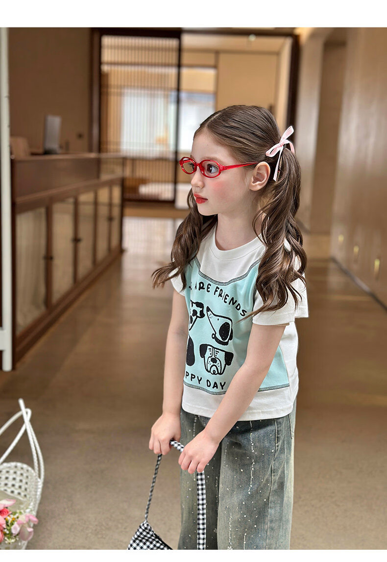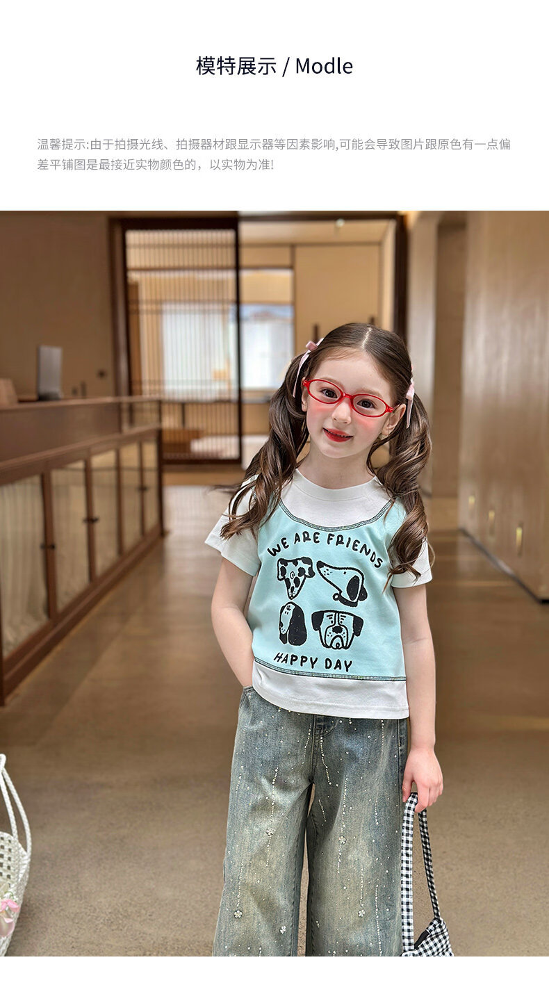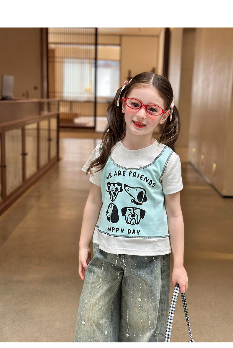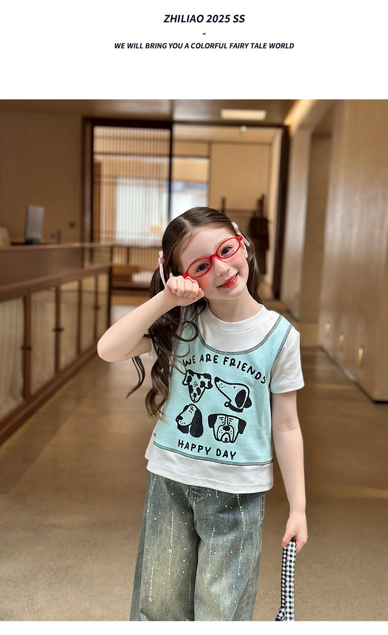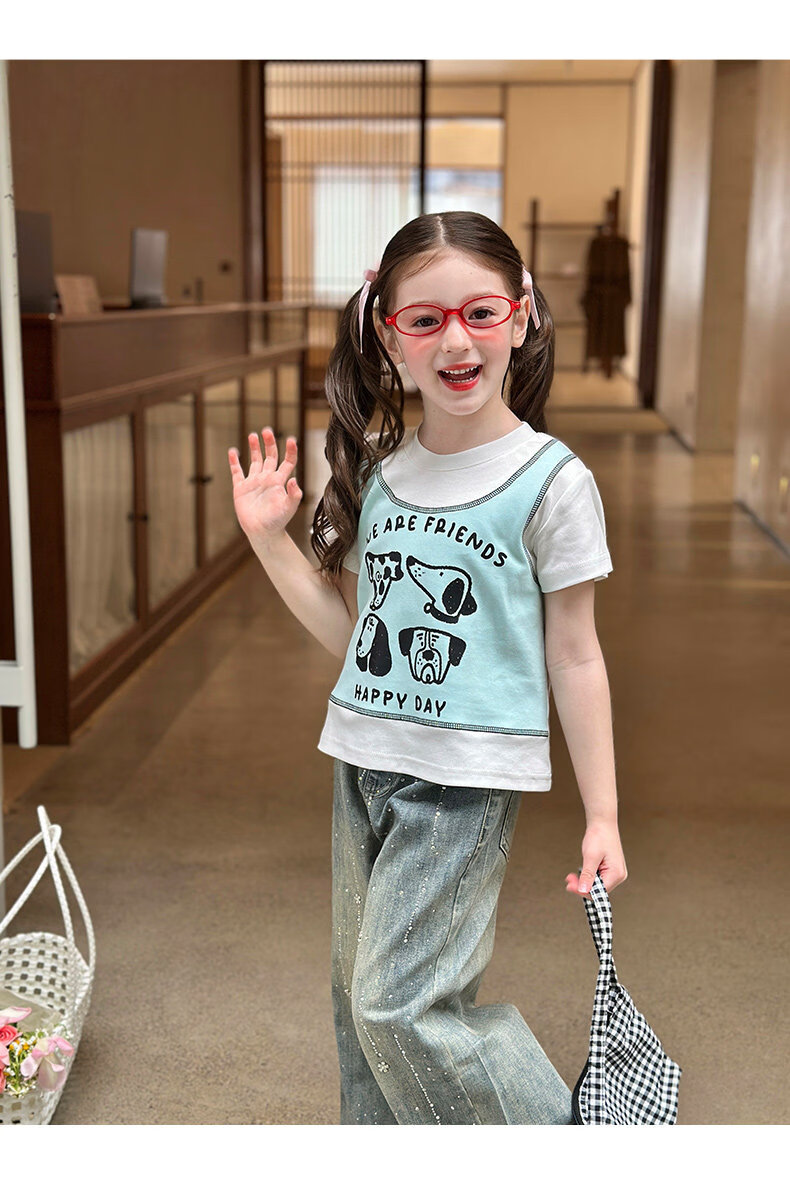 栀了成长记童装女童韩版假两件宽松上衣2026春季儿童可爱印花T恤 牛仔裤 100 cm