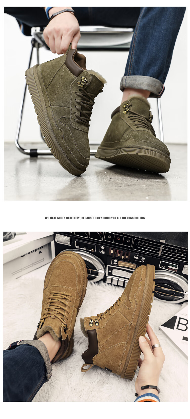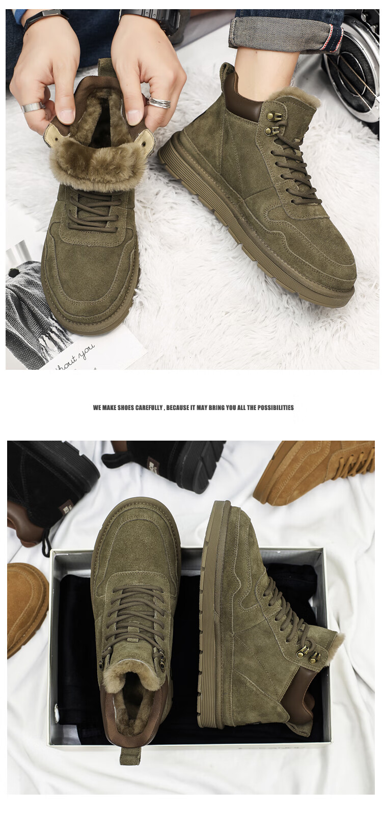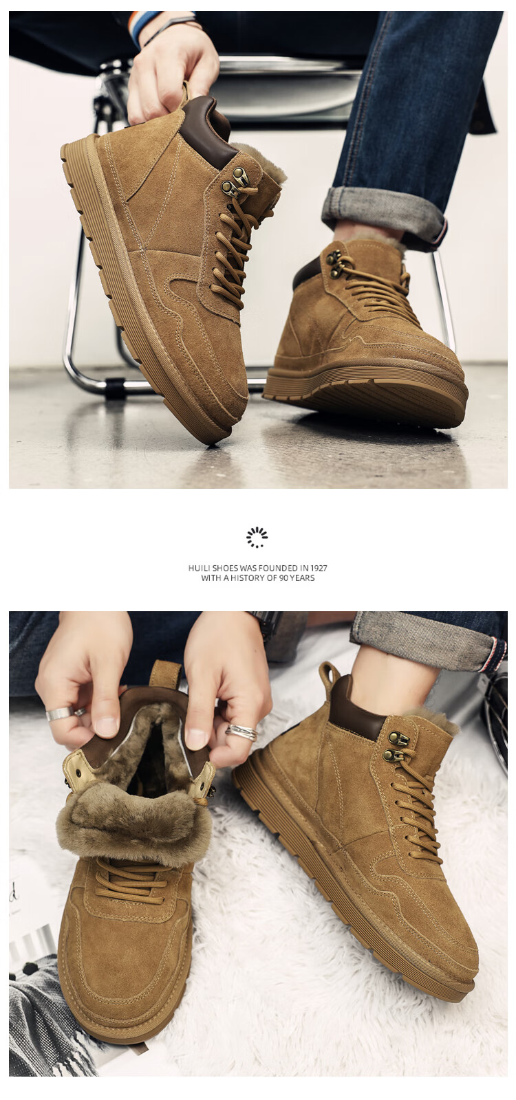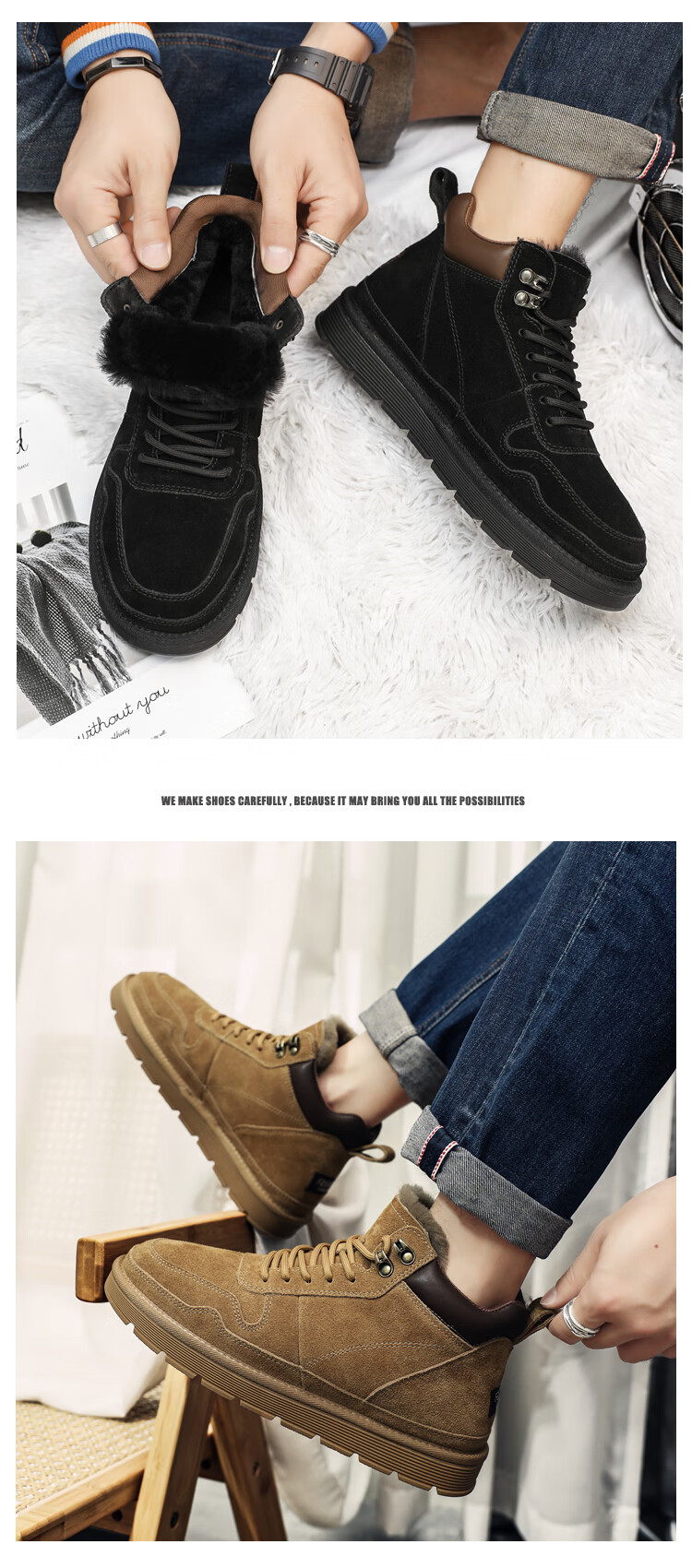稻草人(MEXICAN)羊毛雪地靴男户外抗寒防滑真皮冬季加绒加厚保暖东北高帮大棉鞋子 棕色 38