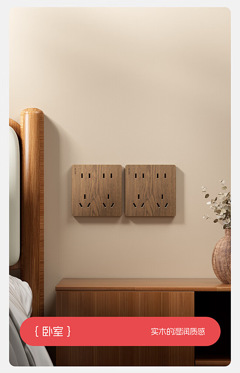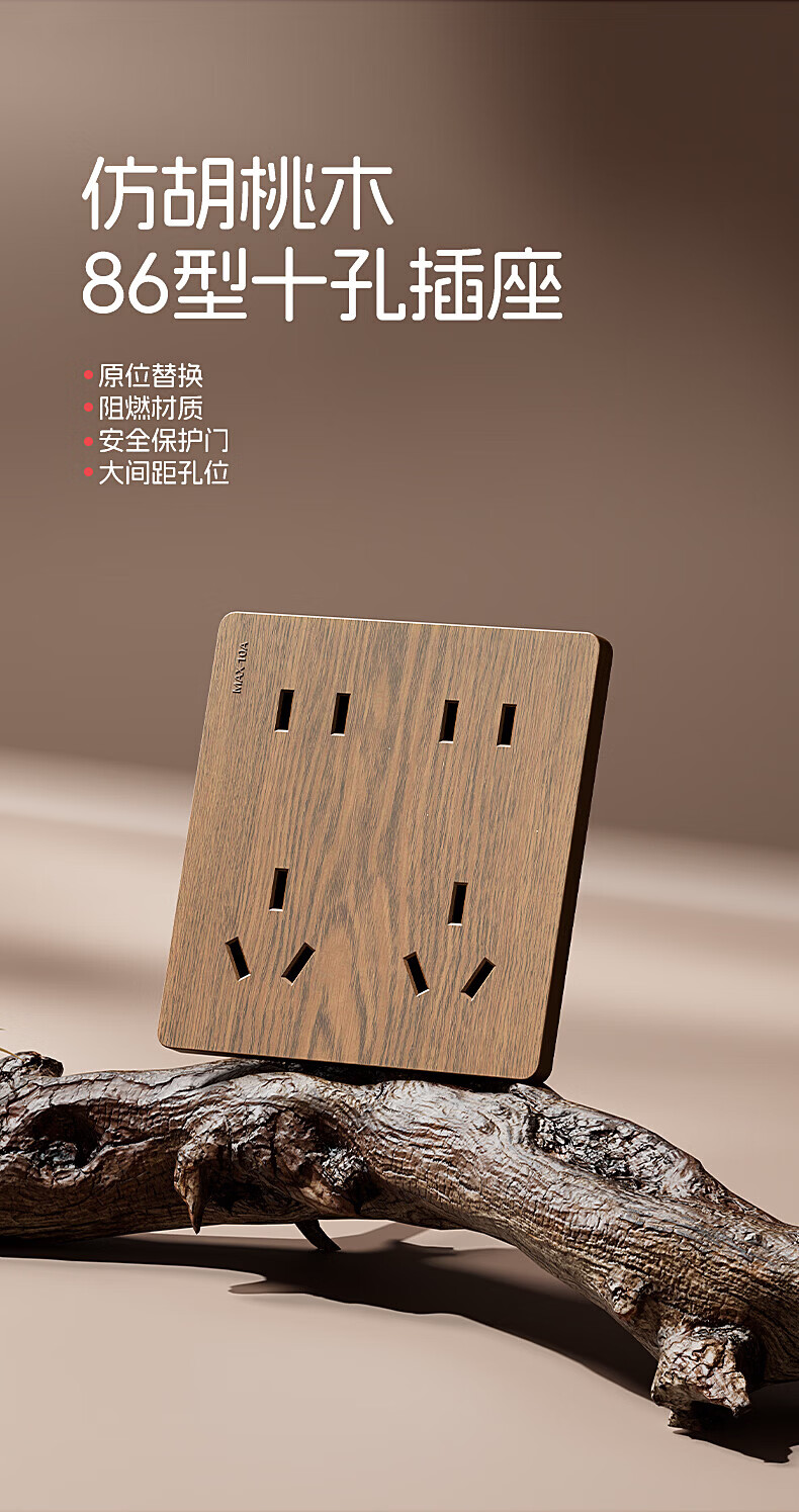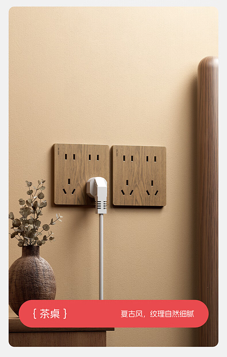 国际电工(FDD)复古木纹开关插座86型暗装面板中古风民宿卧室新国标十孔电源插板 胡桃木纹错位五孔