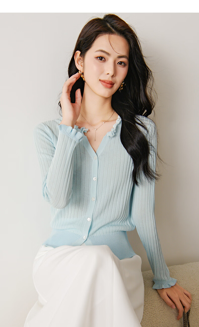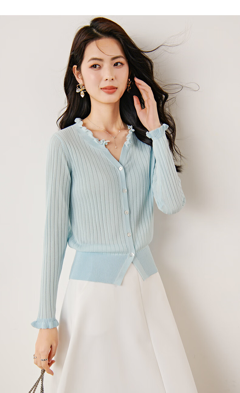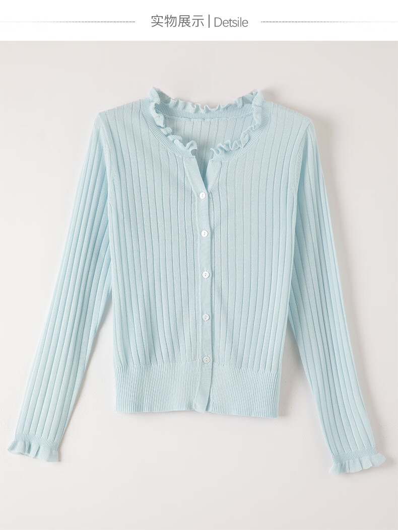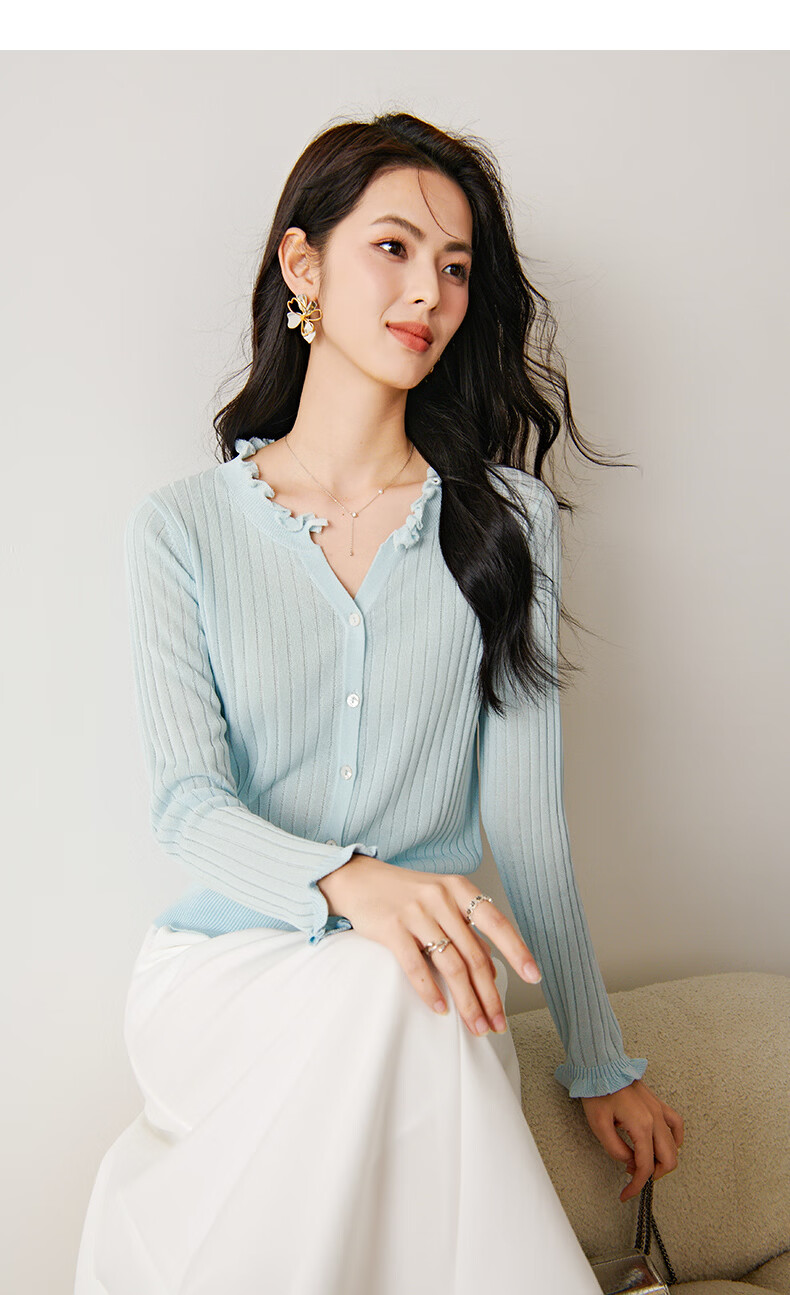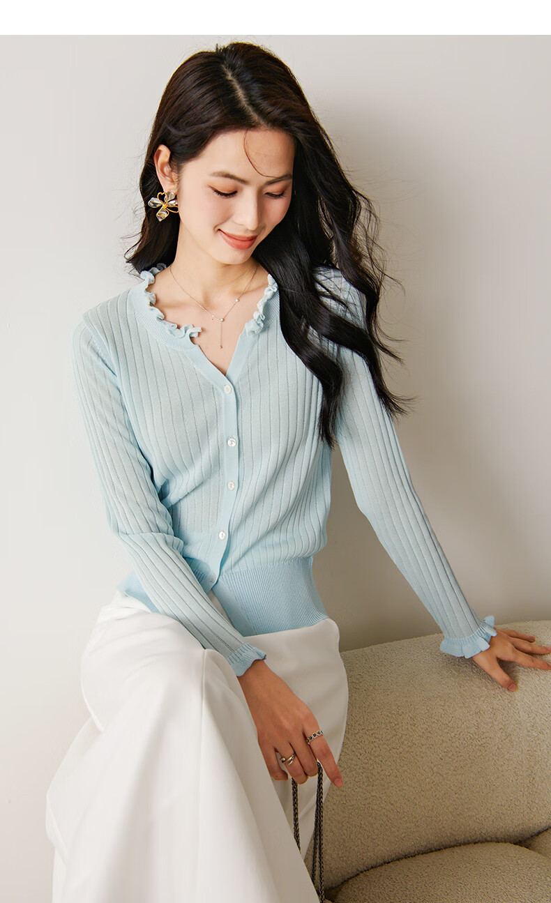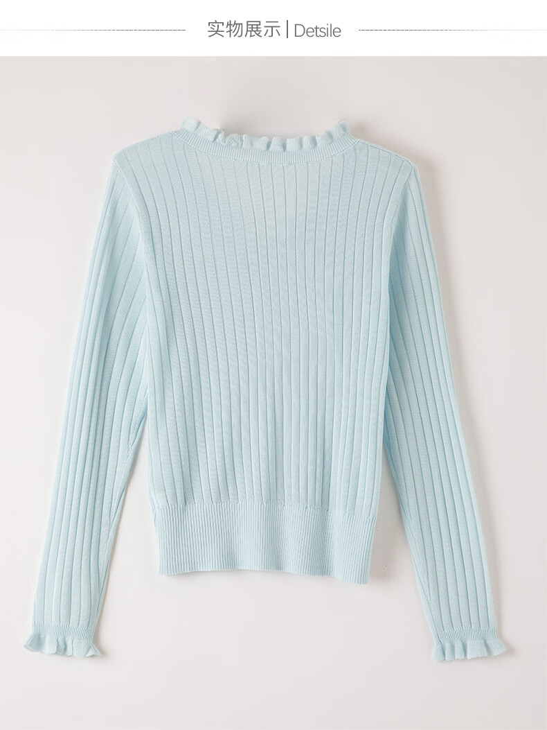晚白2026年春款清新温柔法式花边V领上衣显白竖坑条肌理感针织衫女 浅蓝色 M