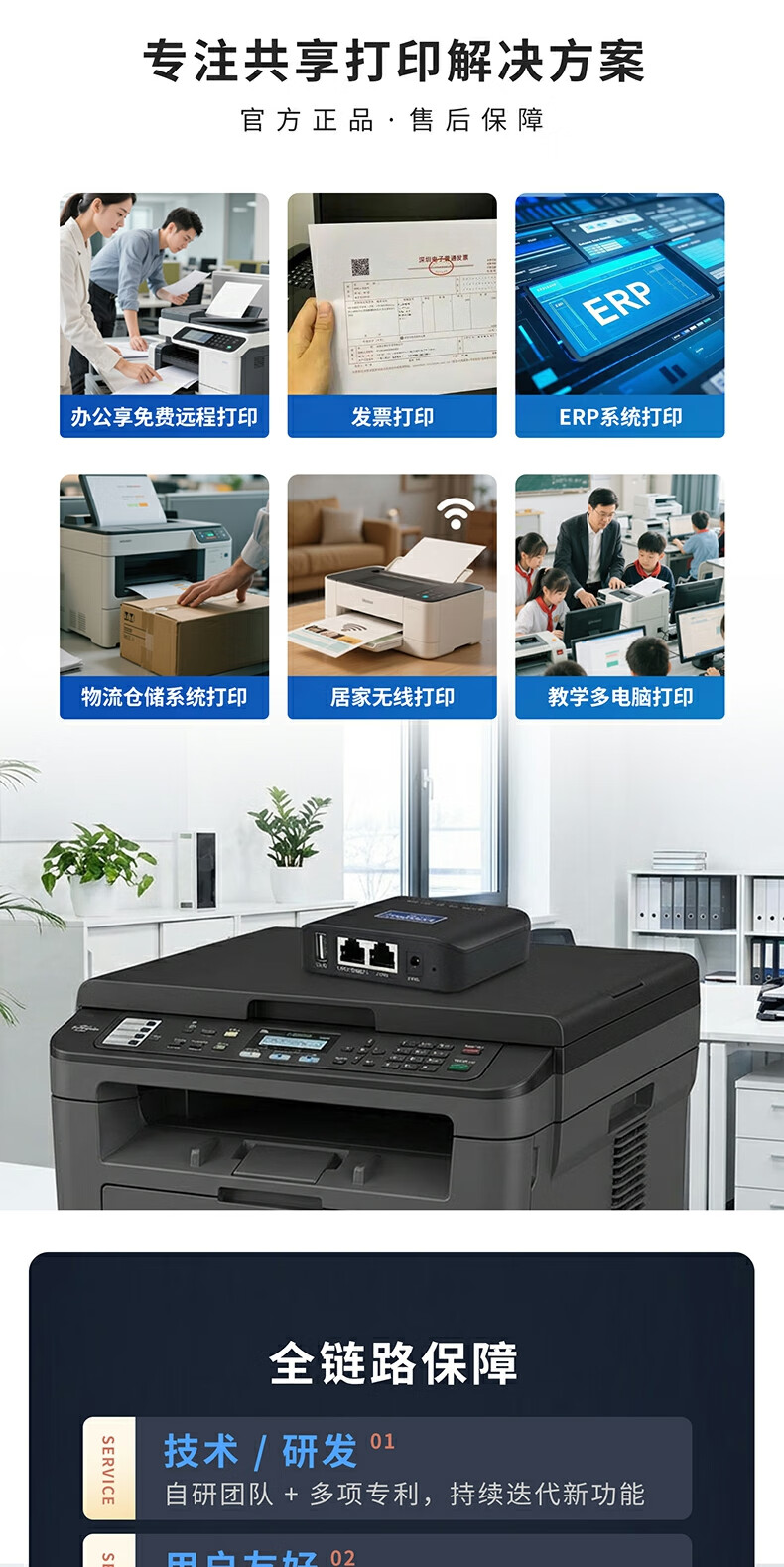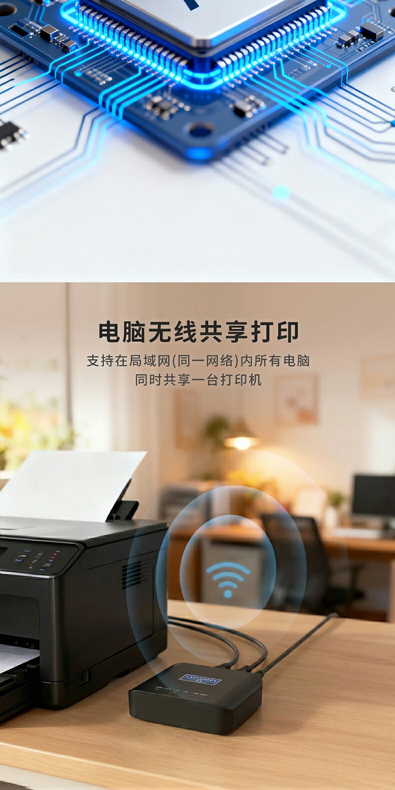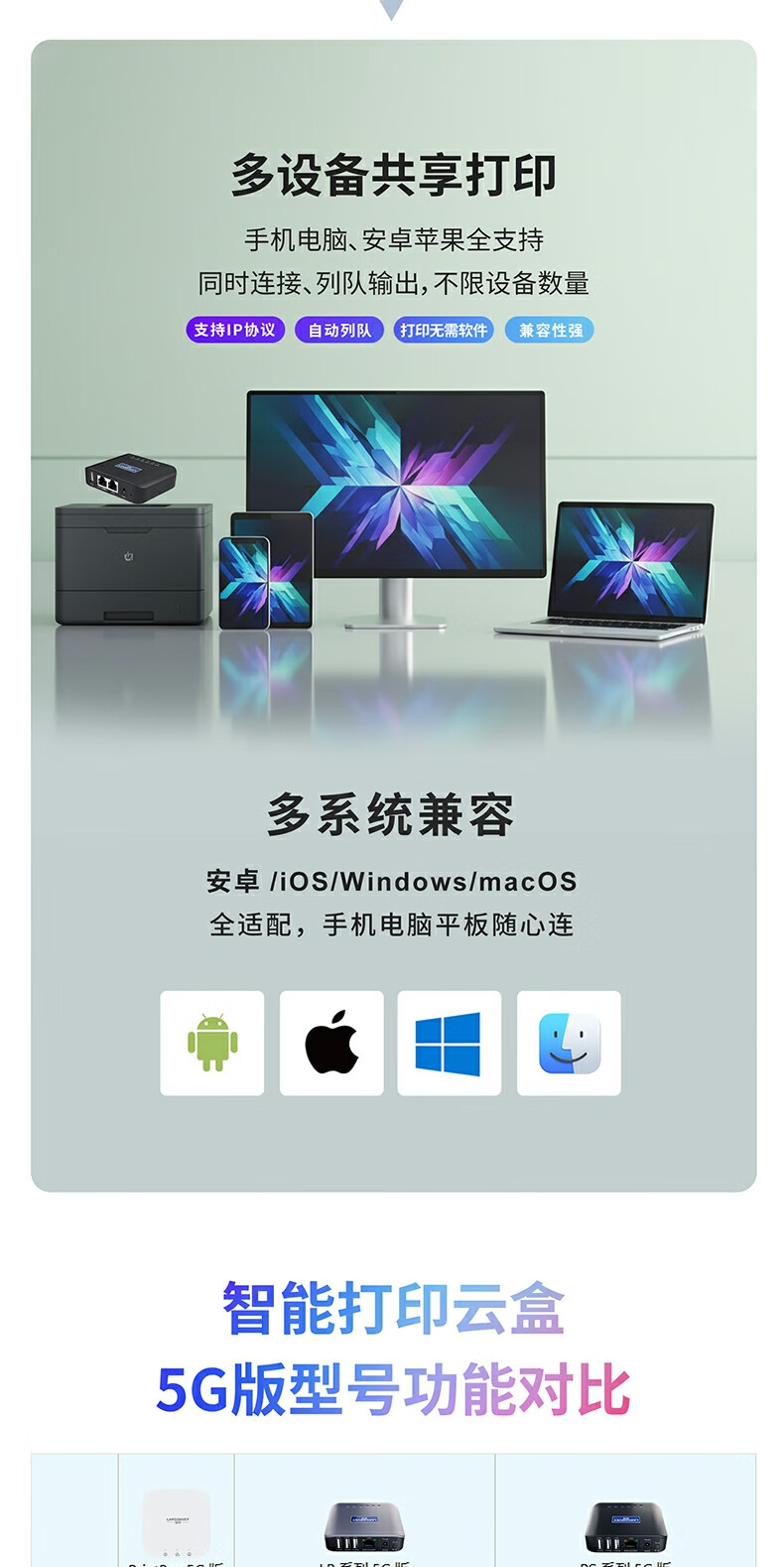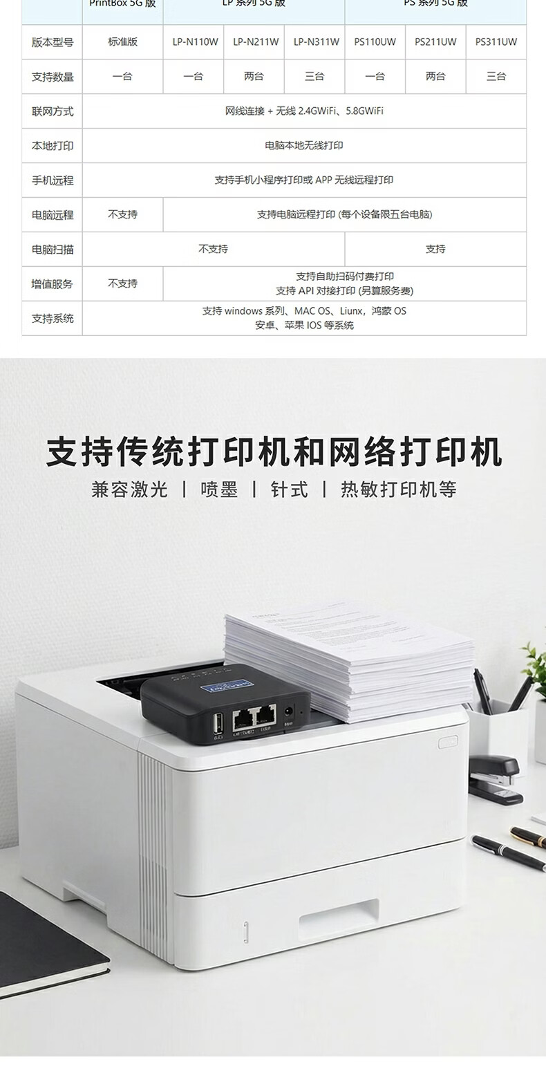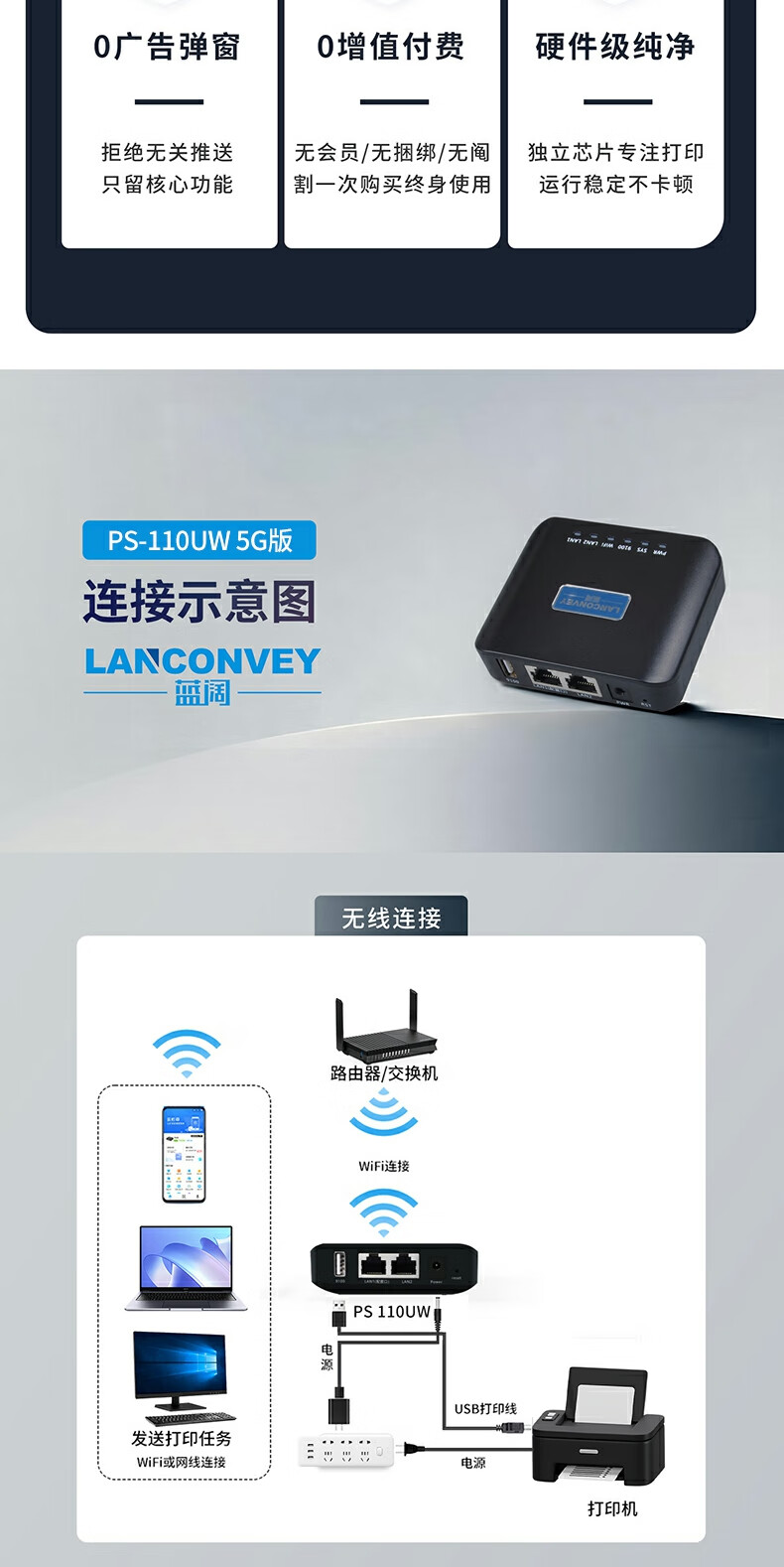 蓝阔支持双频5.8G 2.4GWiFi手机远程电脑无线共享USB打印机转网络 PS110UW 5G版