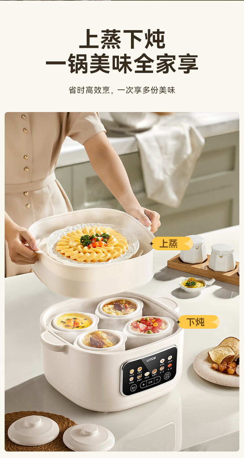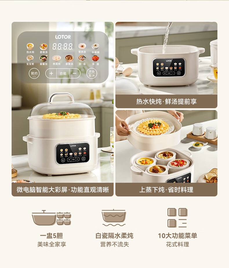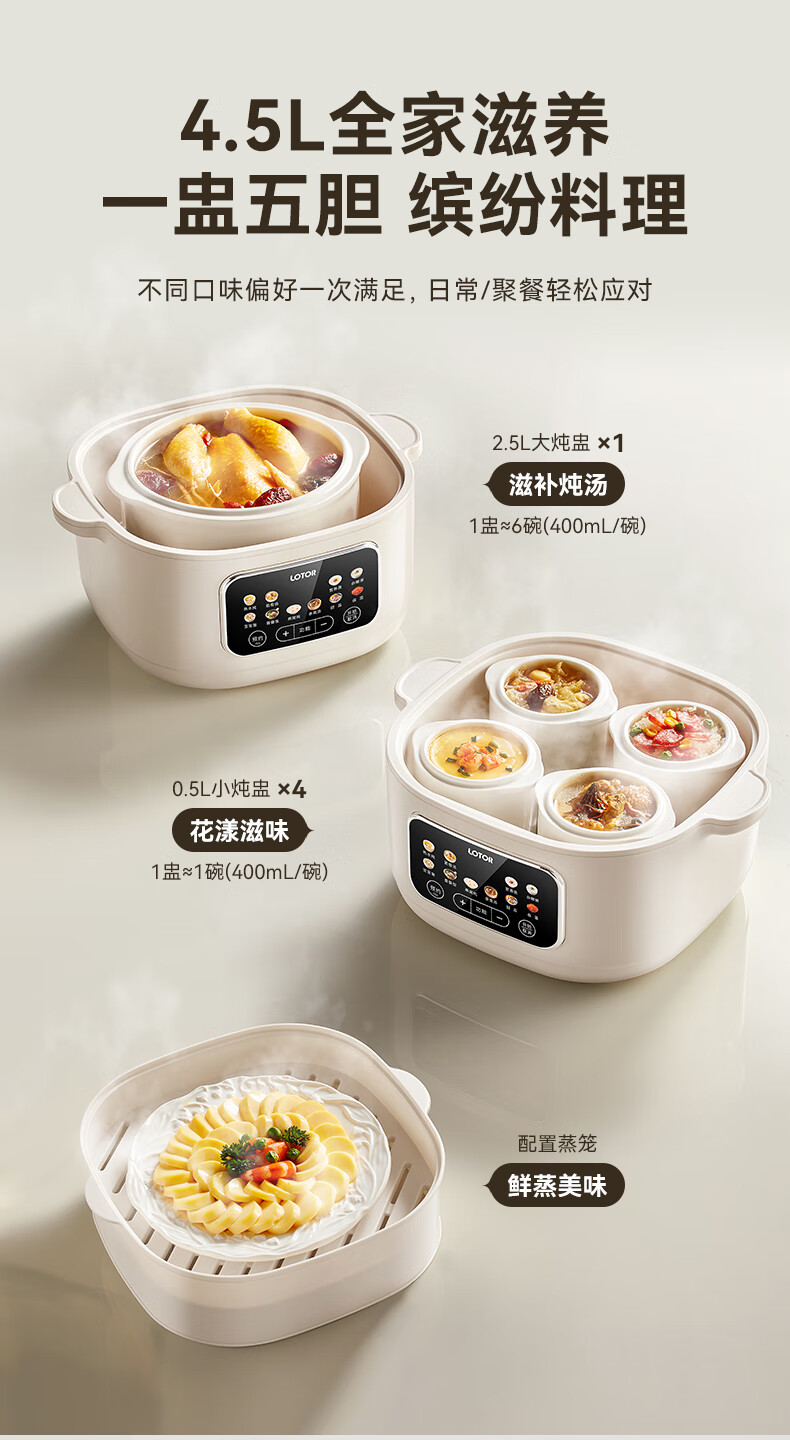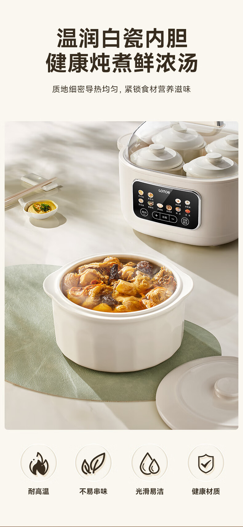 LOTOR徕多电炖锅电炖盅家用全自动炖汤盅3-4人用燕窝炖盅隔水大容量炖锅白瓷煲汤锅电砂锅辅食煮粥神器 白色 4.5L 一锅五胆款