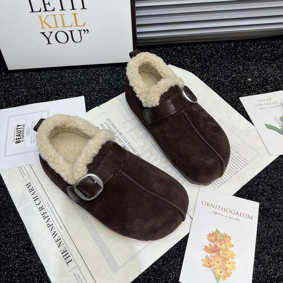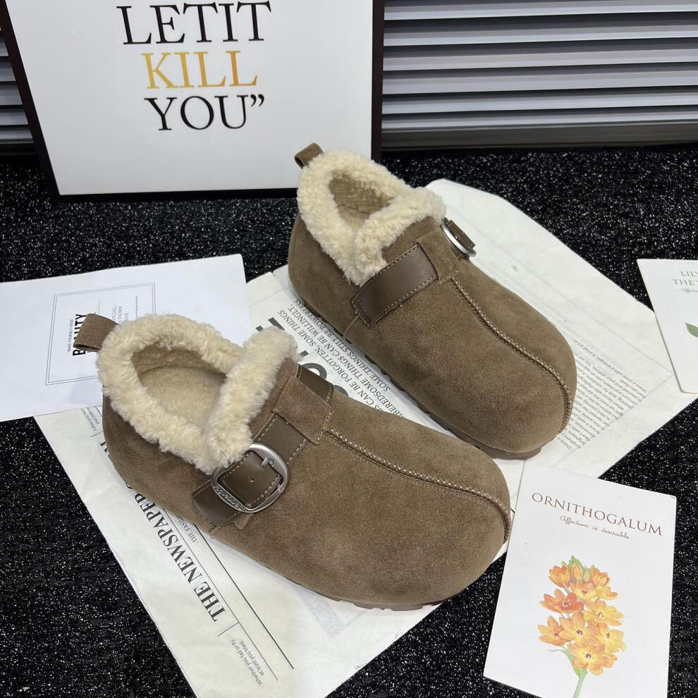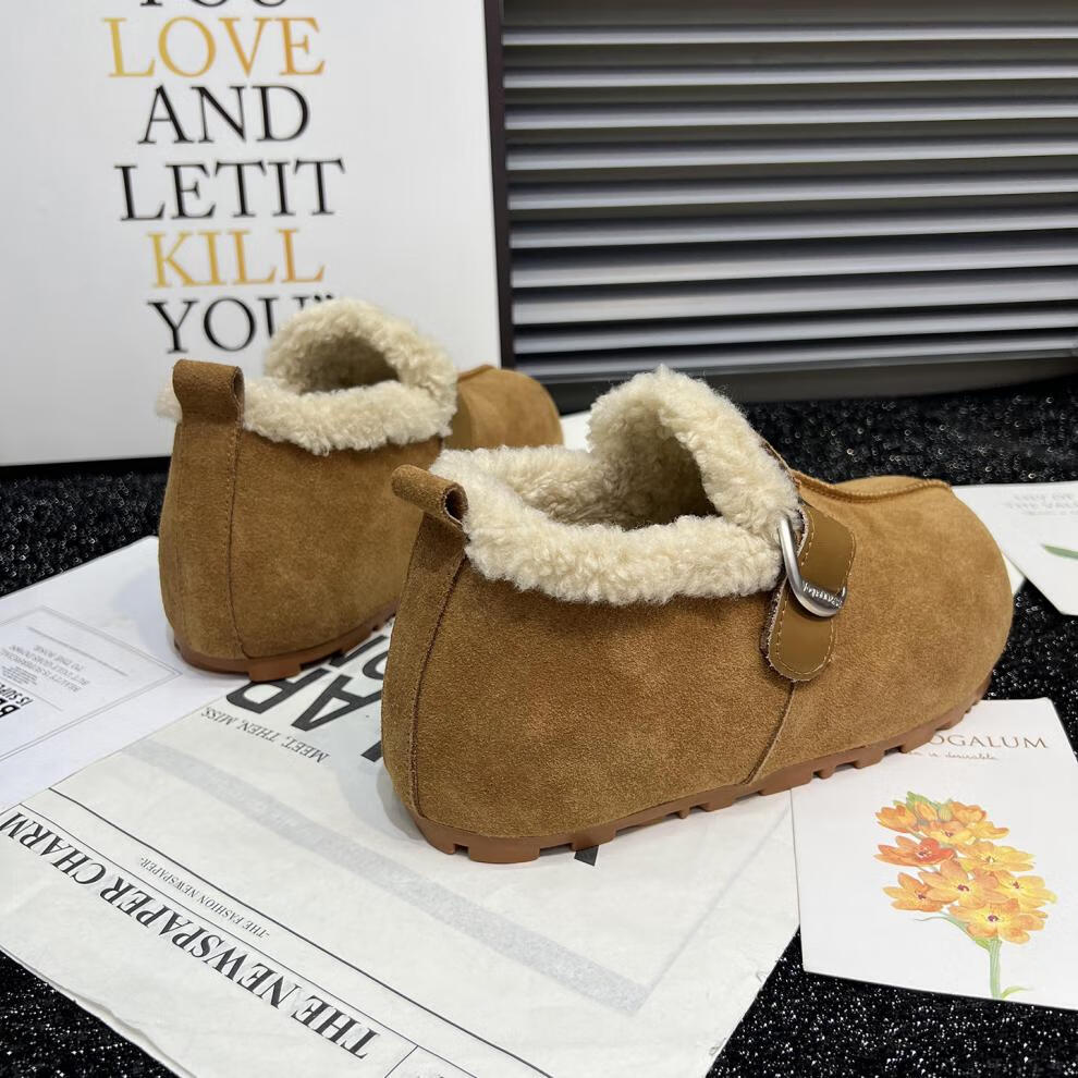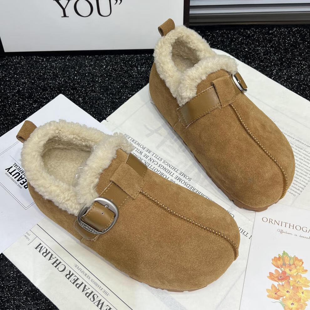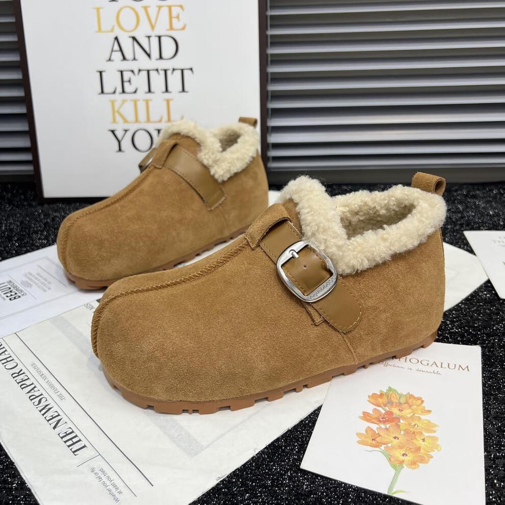 稻草人(MEXICAN)真皮厚底勃肯鞋女2026秋冬新款内增高百搭加绒保暖雪地棉鞋毛毛鞋 驼色95%的选择【升级版】 35