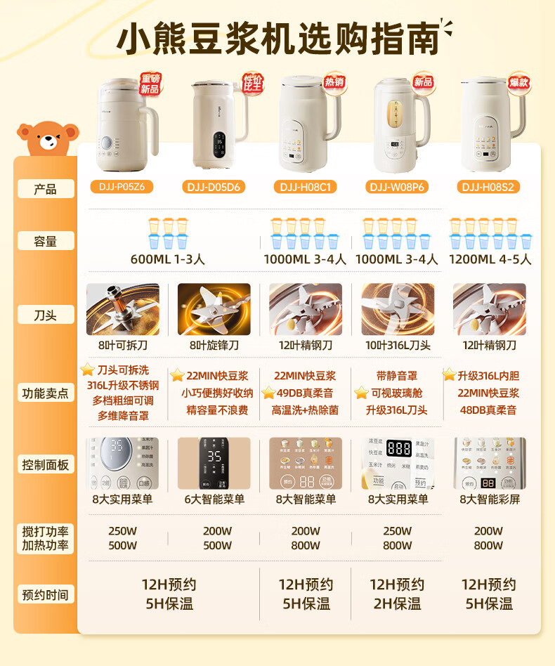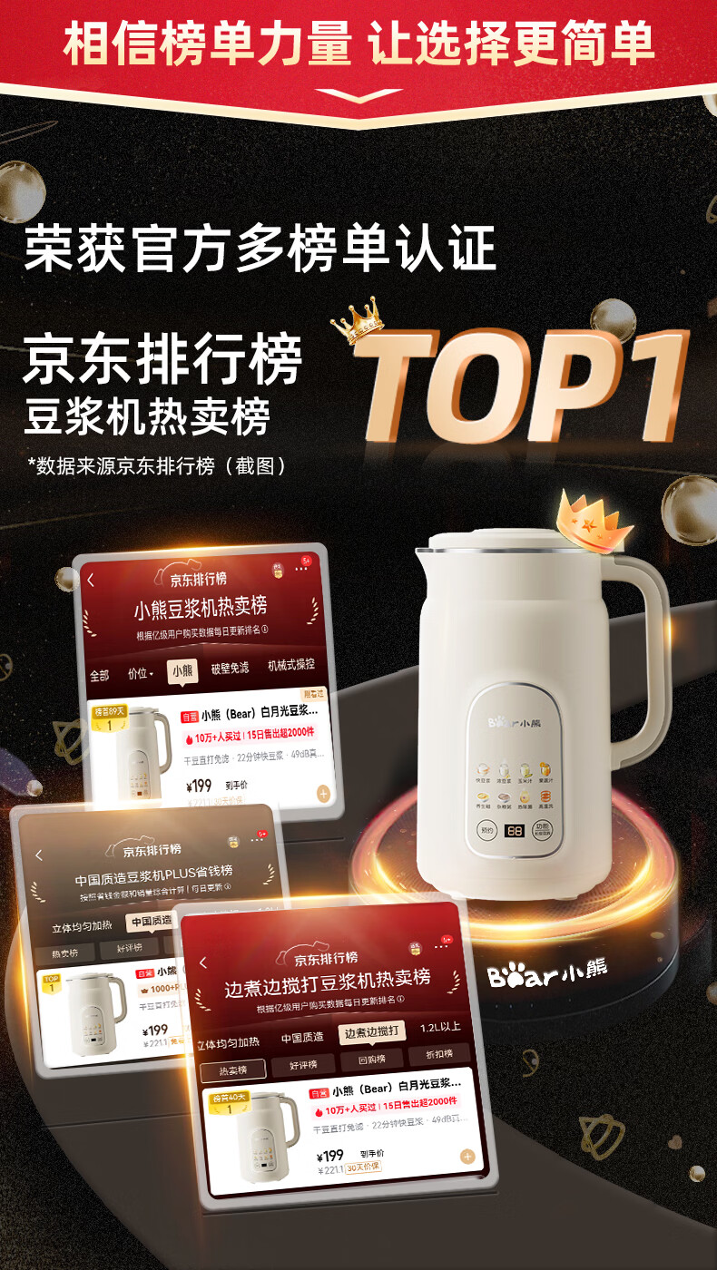 小熊(Bear)白月光豆浆机破壁机家用1L快豆浆大容量3-4人用全自动免煮2025新款多功能免过滤一键清洗DJJ-H08C1