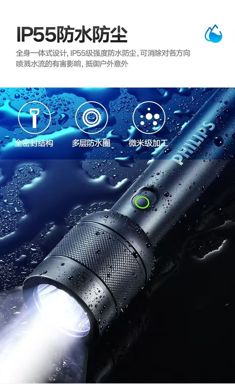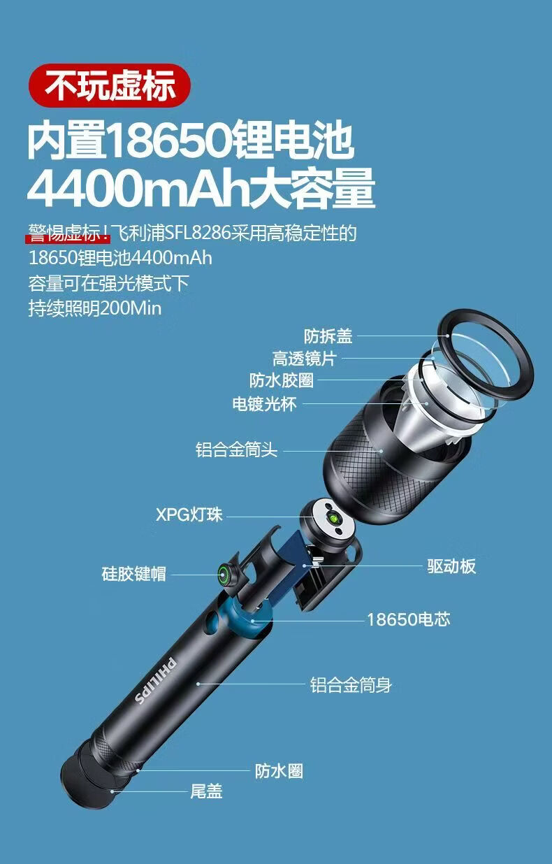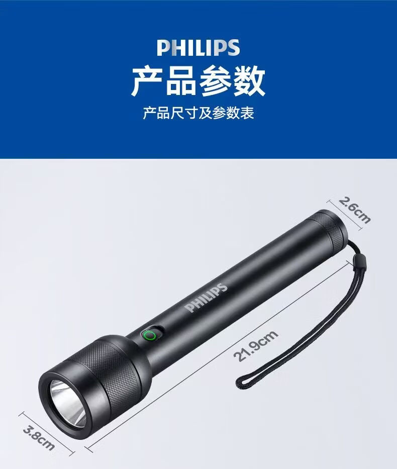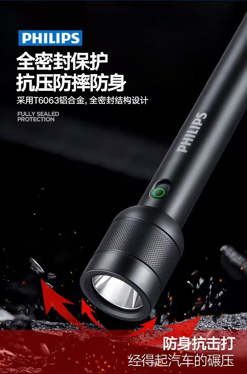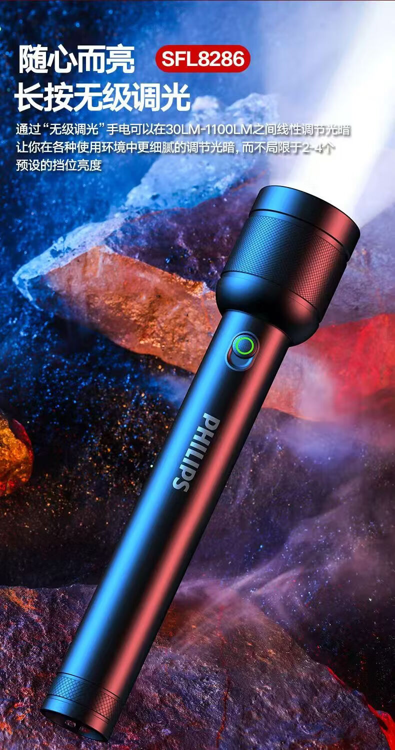 飞利浦(PHILIPS)手电筒强光可充电高亮多功能家用户外便携续航长应急照明灯SFL8286 10W/4400毫安/定焦/SFL8286